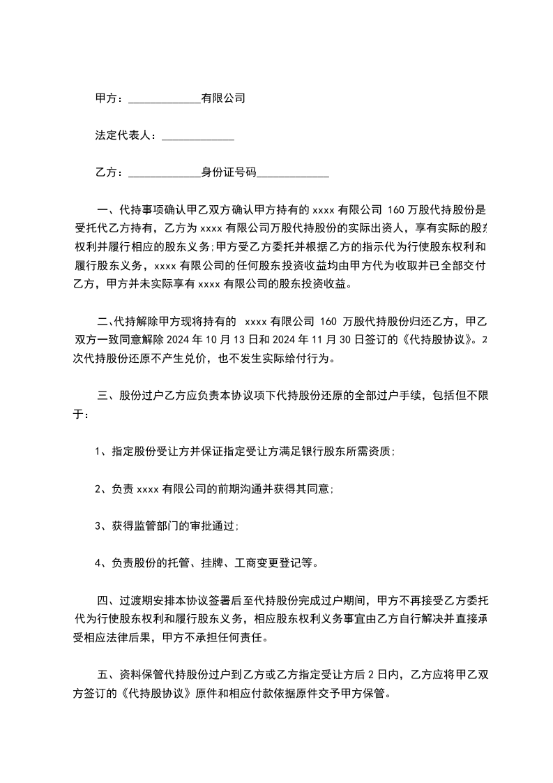 二、代持解除甲方现将持有的xxxx有限公司 160 万股代持股份归还乙方,甲乙双方一致同意解除2024年10月13日和2024年11月30日签订的《代持股协议》。本次代持股份还原不产生兑价,也不发生实际给付行为。