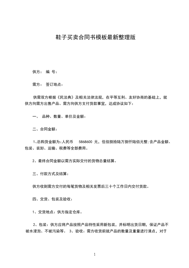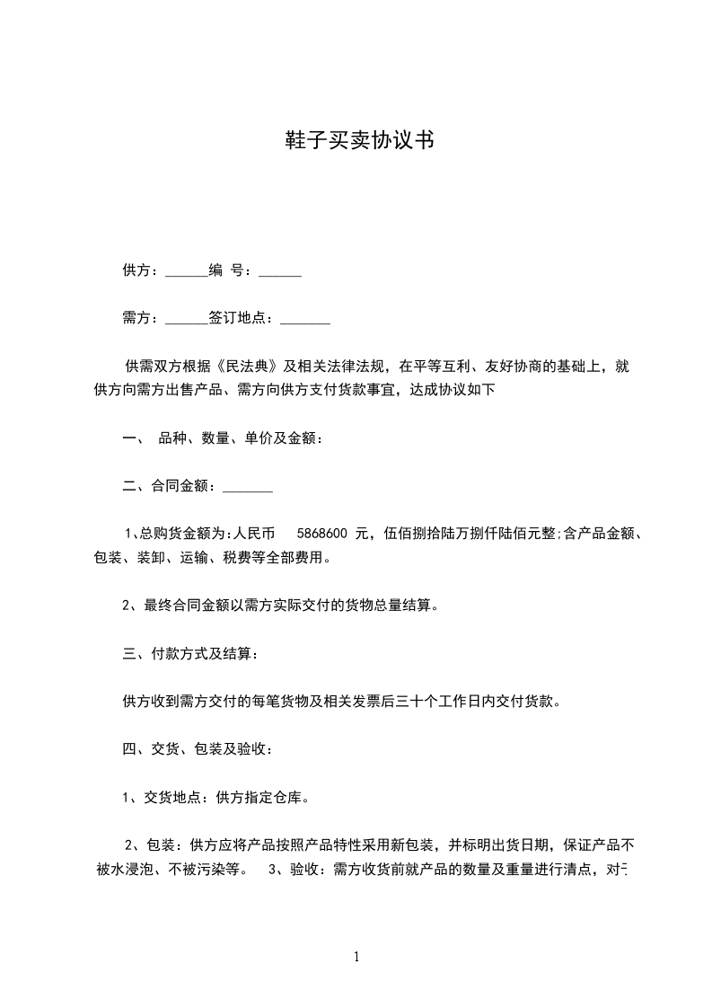 1、总购货金额为:人民币 ____________________元,____________________元整;含产品金额、包装、装卸、运输、税费等全部费用。