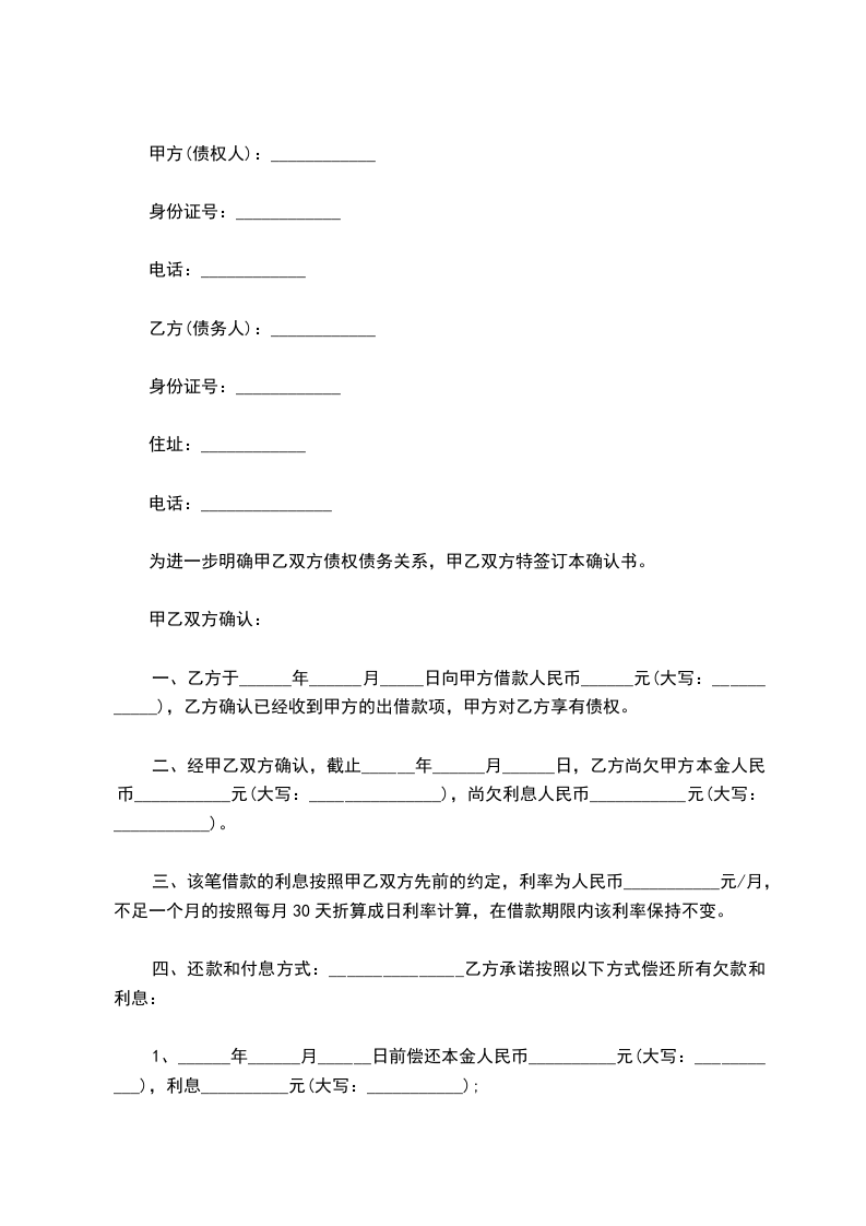 二、经甲乙双方确认,截止_____________年__________月_____日,乙方尚欠甲方本金人民币_____________元(大写:____________),尚欠利息人民币__________元(大写:____________);