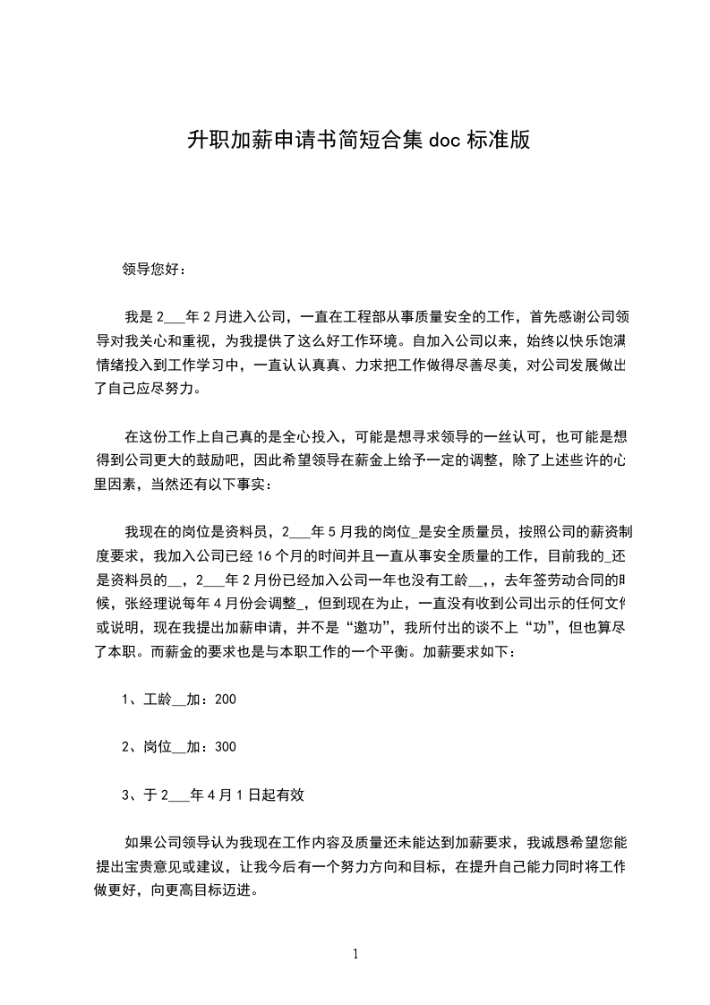 我现在的岗位是资料员,__年5月我的岗位_是安全质量员,按照公司的薪资制度要求,我加入公司已经16个月的时间并且一直从事安全质量的工作,目前我的_还是资料员的--,__年2月份已经加入公司一年也没有工龄--,,去年签_____________的时候,张经理说每年4月份会调整_,但到现在为止,一直没有收到公司出示的任何文件或说明,现在我提出加薪申请,并不是“邀功”,我所付出的谈不上“功”,但也算尽了本职。而薪金的要求也是与本职工作的一个平衡。加薪要求如下: