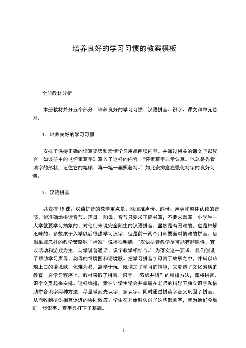本册教材并分五个部分:培养良好的学习习惯、汉语拼音、识字、课文和单元练习。