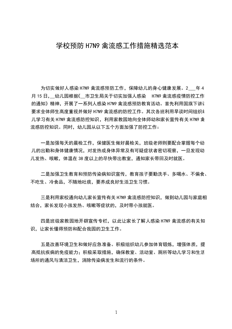 为切实做好人感染H7N9禽流感预防工作,保障幼儿的身心健康发展。2___年4月15日,__幼儿园根据《__市卫生局关于切实加强人感染H7N9禽流感疫情防控工作的通知》精神,开展了一系列人感染H7N9禽流感预防教育活动。首先利用国旗下讲话要求全体师生高度重视并做好H7N9禽流感的防控工作。其次各班利用早谈时间组织幼儿学习有关H7N9禽流感防控知识,利用家教园地向全体师幼和家长宣传有关H7N9禽流感防控知识。同时,幼儿园从以下五个方面加强了防控工作: