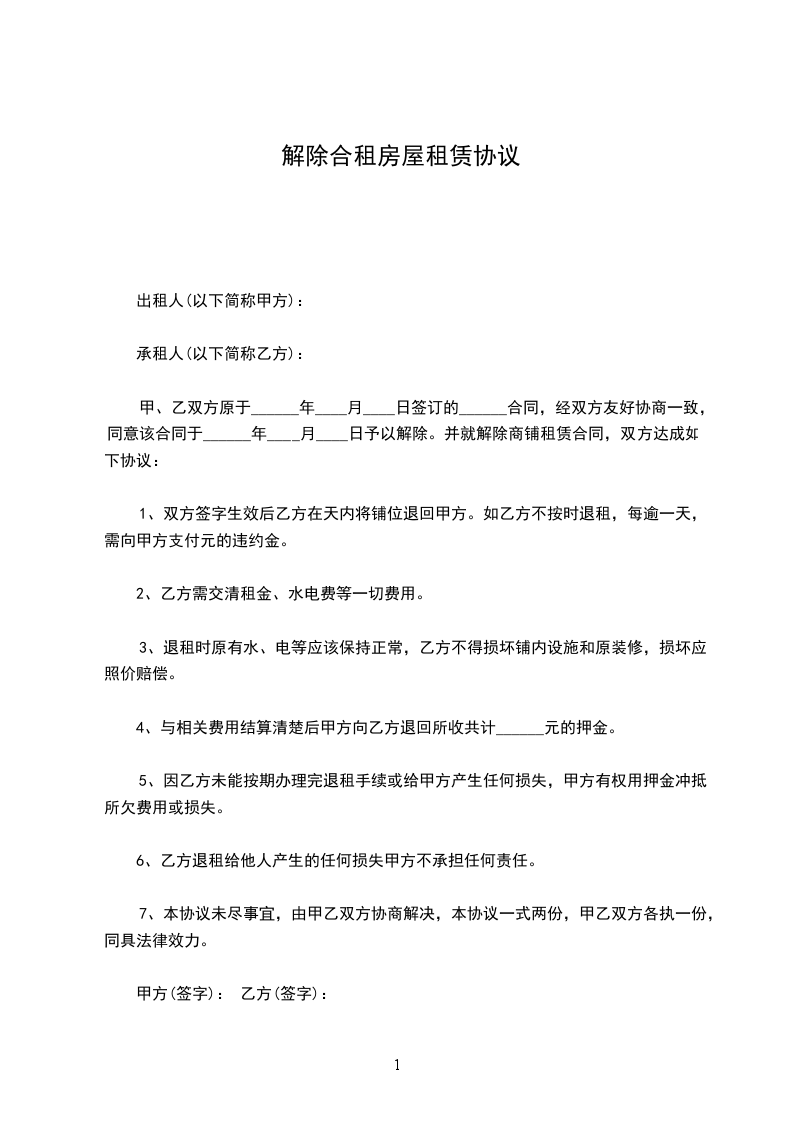 甲、乙双方原于______年____月____日签订的______合同,经双方友好协商一致,同意该合同于______年____月____日予以解除。并就解除商铺租赁合同,双方达成如下协议:
