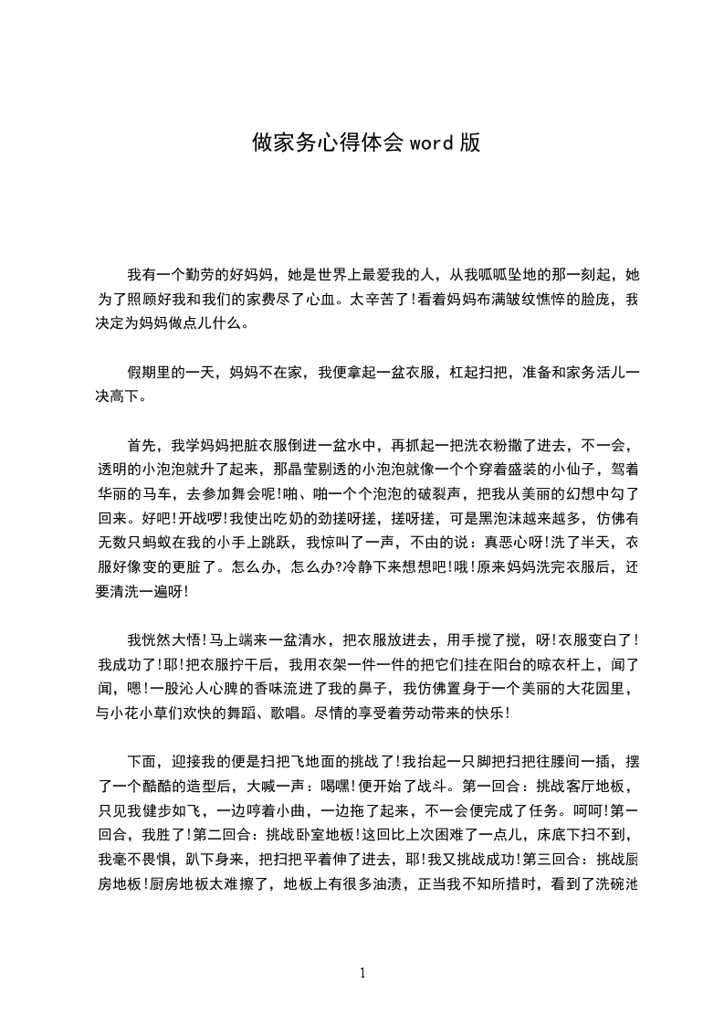 想起了“米尔”的话:母爱是世间最伟大的力量!我振作起来,决定继续做下去。中午,我做了我最拿手的“名菜”方便面,简简单单的。下午,我将所有屋子,扫了扫,拖了拖,汗流浃背的我十分高兴,因为我终于明白了母亲对我无私的爱!