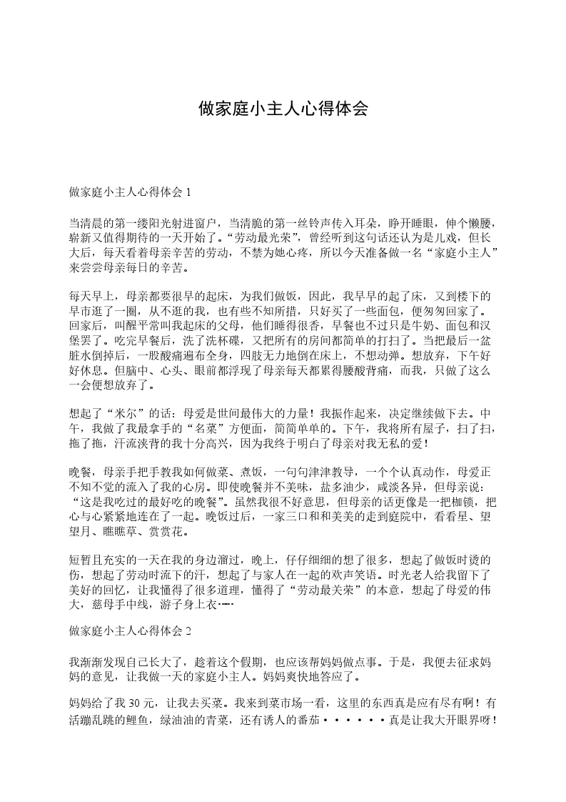 做家庭小主人心得体会2我渐渐发现自己长大了,趁着这个假期,也应该帮妈妈做点事。于是,我便去征求妈妈的意见,让我做一天的家庭小主人。妈妈爽快地答应了。