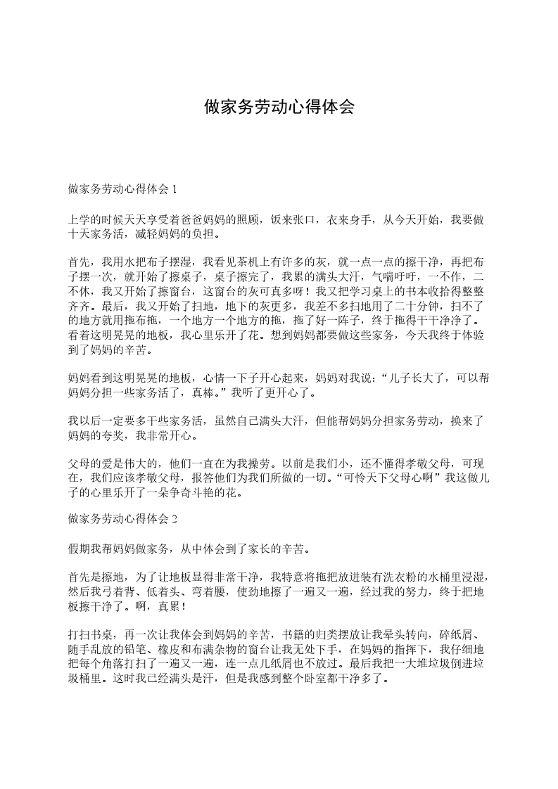 短暂且充实的一天在我的身边溜过,晚上,仔仔细细的想了很多,想起了做饭时烫的伤,想起了劳动时流下的汗,想起了与家人在一起的欢声笑语。时光老人给我留下了美好的回忆,让我懂得了很多道理,懂得了“劳动最关荣”的本意,想起了母爱的伟大,慈母手中线,游子身上衣……