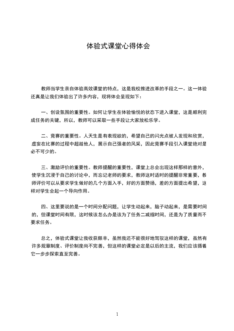 总之,体验式课堂让我收获颇丰,虽然我还不能很好地驾驭这样的课堂,虽然有许多规章制度、评价制度尚不完善,但这样的课堂必定是以后的主流,我们应该循着它一步步探索直至完善。