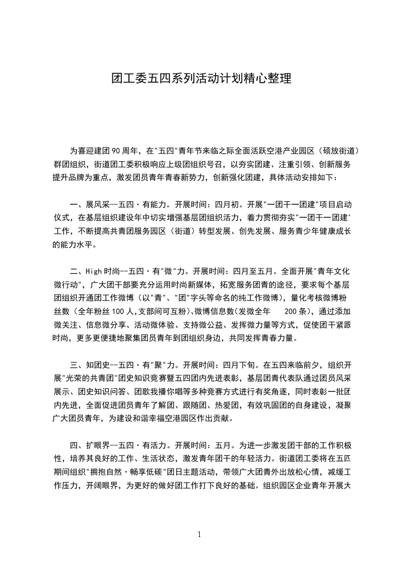 一、展风采--五四·有能力。开展时间:四月初。开展"一团干一团建"项目启动仪式,在基层组织建设年中切实增强基层团组织活力,着力贯彻夯实"一团干一团建"工作,不断提高共青团服务园区(街道)转型发展、创先发展、服务青少年健康成长的能力水平。