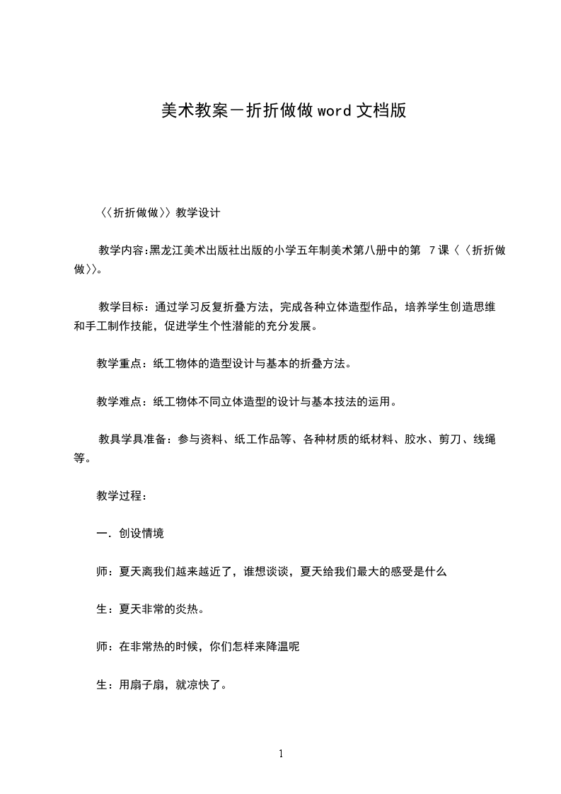 教学目标:通过学习反复折叠方法,完成各种立体造型作品,培养学生创造思维和手工制作技能,促进学生个性潜能的充分发展。