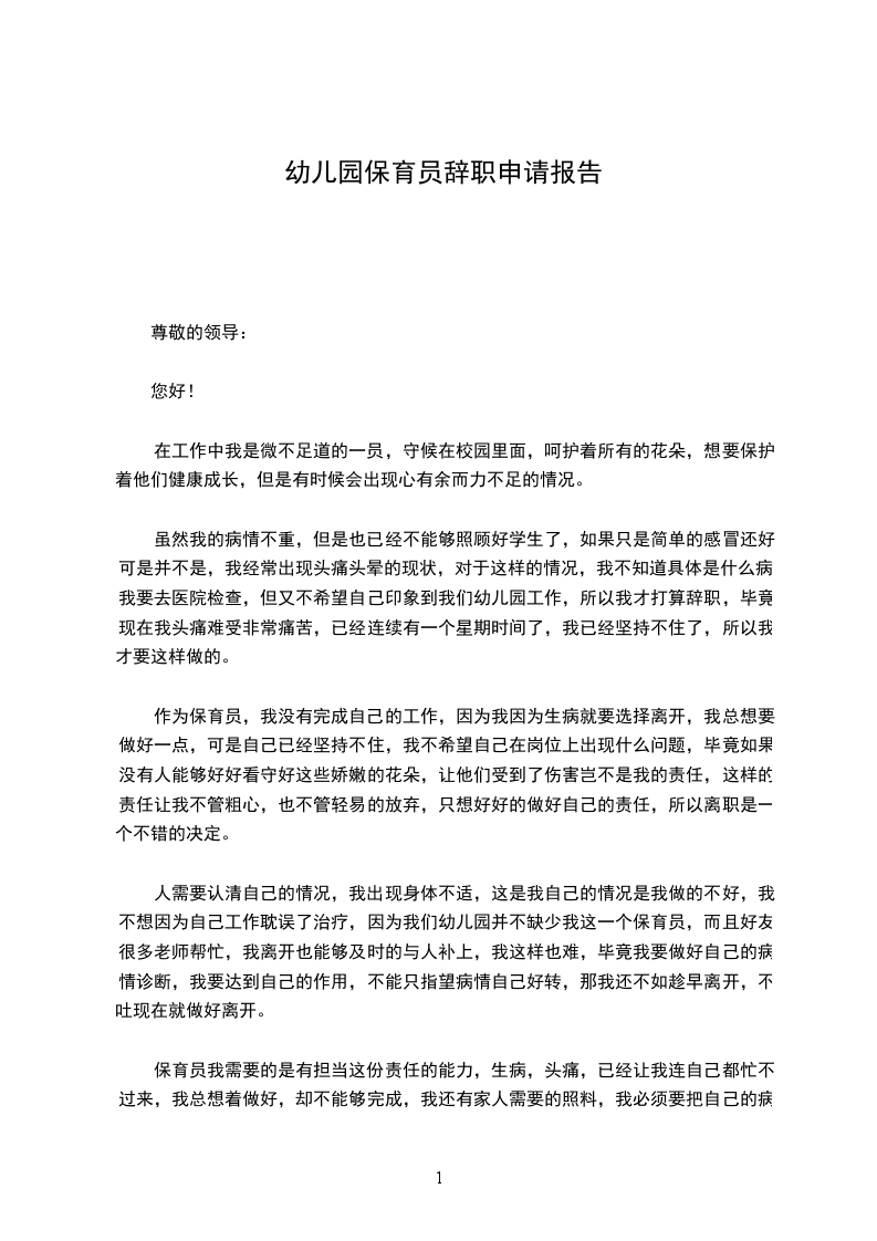 虽然我的病情不重,但是也已经不能够照顾好学生了,如果只是简单的感冒还好可是并不是,我经常出现头痛头晕的现状,对于这样的情况,我不知道具体是什么病,我要去医院检查,但又不希望自己印象到我们幼儿园工作,所以我才打算辞职,毕竟现在我头痛难受非常痛苦,已经连续有一个星期时间了,我已经坚持不住了,所以我才要这样做的。