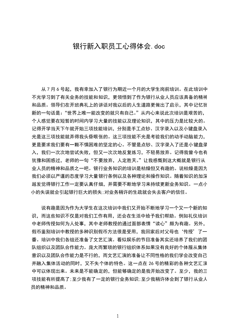 从7月6号起,我有幸加入了银行为期近一个月的大学生岗前培训。在此培训中不光学习到了有关业务的技能和知识,更领悟到了作为银行从业人员应该具备的精神和品质。领导们在开班典礼上的讲话对我以后的人生道路更做出了启示,其中记忆犹新的一句话是:“世界上唯一能改变的就只有自己。”从内心来说此次培训是艰苦的,个人感觉要在短暂的时间内学习大量的技能以及理论知识,其中的压力是比较大的。记得开学当天下午就开始三项技能培训,分别是手工点钞、汉字录入以及小键盘录入。光是这三项技能就弄得我头昏眼张的。这三项技能不光是考验我们的动手动脑能力,更是要求我们要有一颗不惧困难的坚定的心。不管是点钞、汉字录入了还是小键盘录入,我们一次次地尝试失败,但又一次次地反复练习,不轻易放弃。记得我曾今也有犹豫和困惑过,老师的一句“不要放弃,人定胜天。”让我感慨到这大概就是银行从业人员的精神和品质之一吧。银行业务知识的培训是枯燥但又有趣的。说枯燥是因为我们必须以严谨的态度学习大量银行条例以及各种理论和操作知识。随着知识的加深越发觉得银行工作一定要认真仔细,并需要不断地学习来持续更新业务知识。一点小小的失误就会引起银行巨大的损失;对业务稍许的生疏就会失去客户的信任。