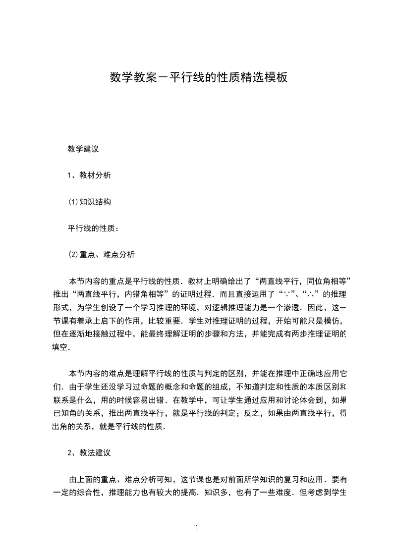 本节内容的重点是平行线的性质.教材上明确给出了“两直线平行,同位角相等”推出“两直线平行,内错角相等”的证明过程.而且直接运用了“∵”、“∴”的推理形式,为学生创设了一个学习推理的环境,对逻辑推理能力是一个渗透.因此,这一节课有着承上启下的作用,比较重要.学生对推理证明的过程,开始可能只是模仿,但在逐渐地接触过程中,能最终理解证明的步骤和方法,并能完成有两步推理证明的填空.