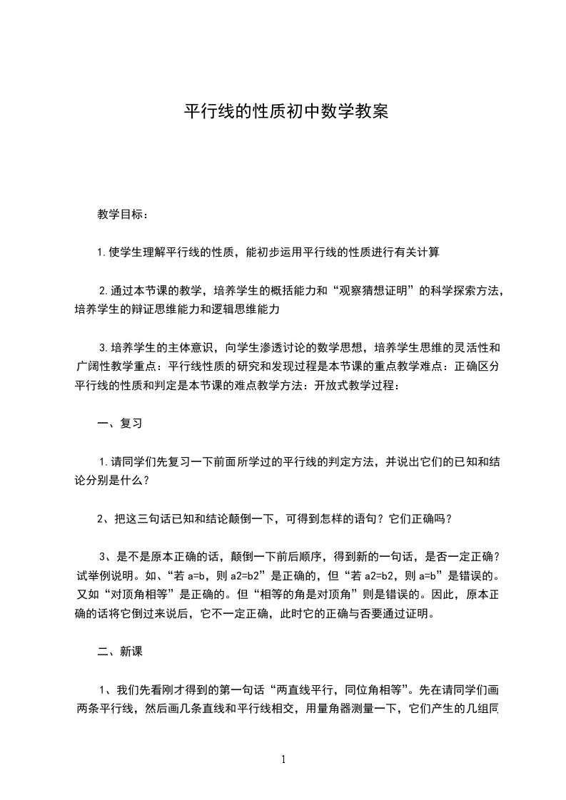 1.使学生理解平行线的性质,能初步运用平行线的性质进行有关计算.