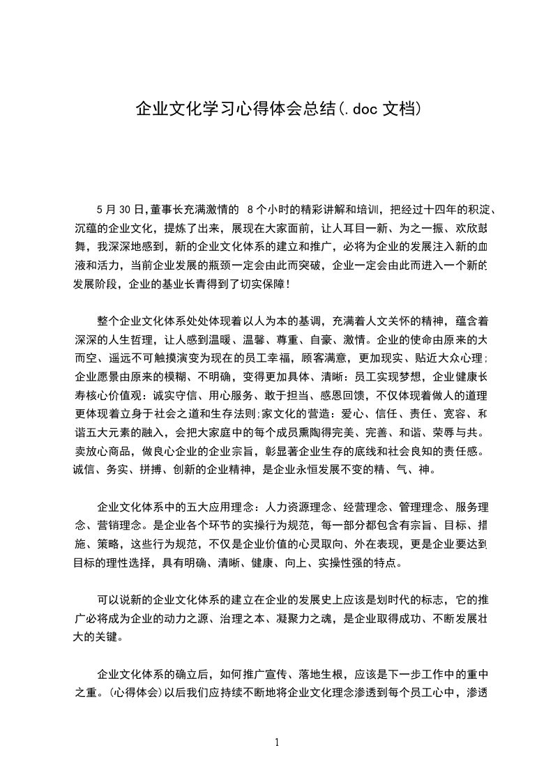 企业文化体系的确立后,如何推广宣传、落地生根,应该是下一步工作中的重中之重。(心得体会)以后我们应持续不断地将企业文化理念渗透到每个员工心中,渗透到大家的服务工作和管理工作中;贯穿于每个工作流程、工作标准、工作考核中,把企业文化理念作为我们的行动指南,让所有员工都能够共有企业文化所体现的思维方式和行为习惯,如此,企业内部、各部门之间的沟通和协调才能轻易实现,企业内部的凝聚力才能真正增强。只有当员工深刻的意识到自己的行为是符合企业文化要求的,处处以企业文化来严格要求自己,那么企业文化才能真正的发挥其终极的效果。