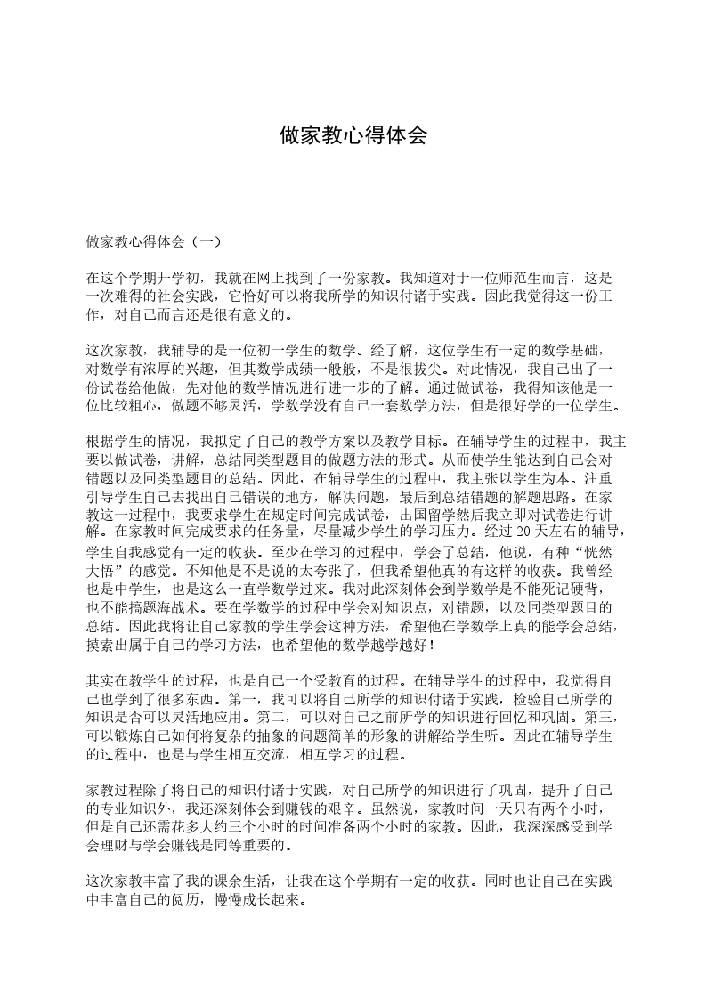 做家教心得体会(二)在大学的第一个寒假,我迎来了人生的第一次家教,另一方面作为学校布置的社会实践,我兴冲冲的开始了我的第一份工作,对于教人而言,我还完全是个生手,丝毫没有经验,不过这并没有影响我的信心,学生是个高二的特长生,要帮她补高一的英语,对我这个已经迈入大学的大学生而言,应该不成问题,关键是要把他教好,要真正的让她在寒假有所收获。这一次的学习中学到东西,而不仅仅是消磨时间。这便成了我对这份工作的最终目的。