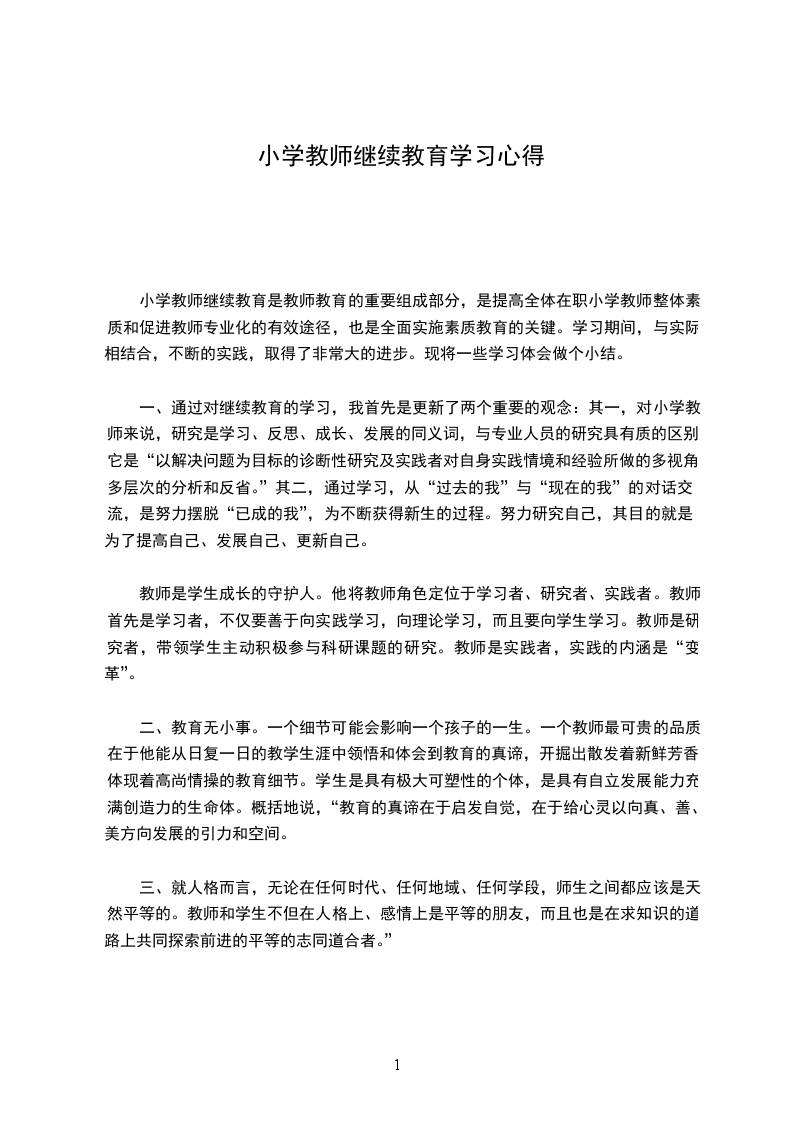 一、通过对继续教育的学习,我首先是更新了两个重要的观念:其一,对小学教师来说,研究是学习、反思、成长、发展的同义词,与专业人员的研究具有质的区别。它是“以解决问题为目标的诊断性研究及实践者对自身实践情境和经验所做的多视角、多层次的分析和反省。”其二,通过学习,从“过去的我”与“现在的我”的对话交流,是努力摆脱“已成的我”,为不断获得新生的过程。努力研究自己,其目的就是为了提高自己、发展自己、更新自己。
