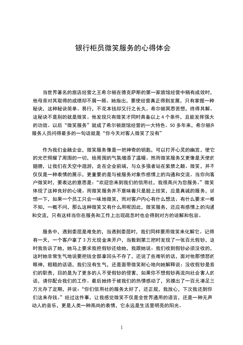 服务中,遇到委屈是难免的,当遇到委屈时,我们同样要用微笑来化解它。记得有一天,一个客户拿了3万元现金来开户,当数到第三把时发现了一张百元假钞,这时我告诉了她,她马上要求我把假钞还给她,我跟她说:我们收到假钞必须没收的,这时她非常生气地说要把钱全部拿回头不存了,还说了些难听的话,面对他那愤怒的眼神,粗糙的话语,我们没有生气,还是面带微笑耐心地向她解释说:没收假钞是我们的职责,目的是为了更多的人不受假钞的侵害,如果你不想假钞再流向社会害人的话,请你配合我们的工作。最后她终于被我们的热情感动了,另摸出了一百元凑足三万元存了定期,并说:“你们信用社的服务太好了,还正规,我放心,下次我还到你们这来存钱。”经过这件事,让我感觉微笑不仅是全世界通用的语言,还是一种无声动人的音乐,更是人类一种高尚的表情,它永远是生活里明亮的阳光。