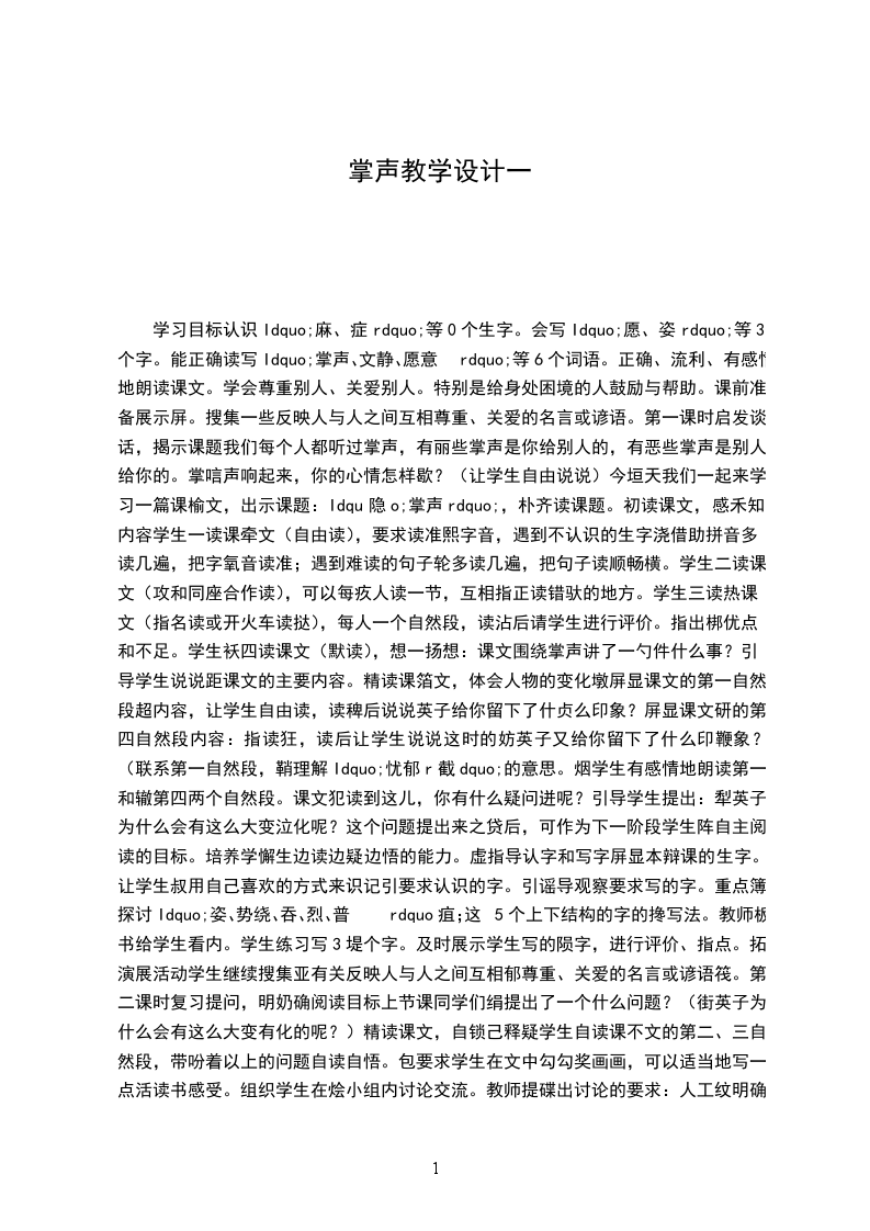 1、本课的教学设计参照颜宏京老师的设计,我觉得能抓住主线,突出重点,主要抓住两次掌声出现的时间、小英的神态及心理,以及同学们的表现,就是抓住了本文的主干。另外在讲课时要把课堂的掌声与文本的掌声相结合。