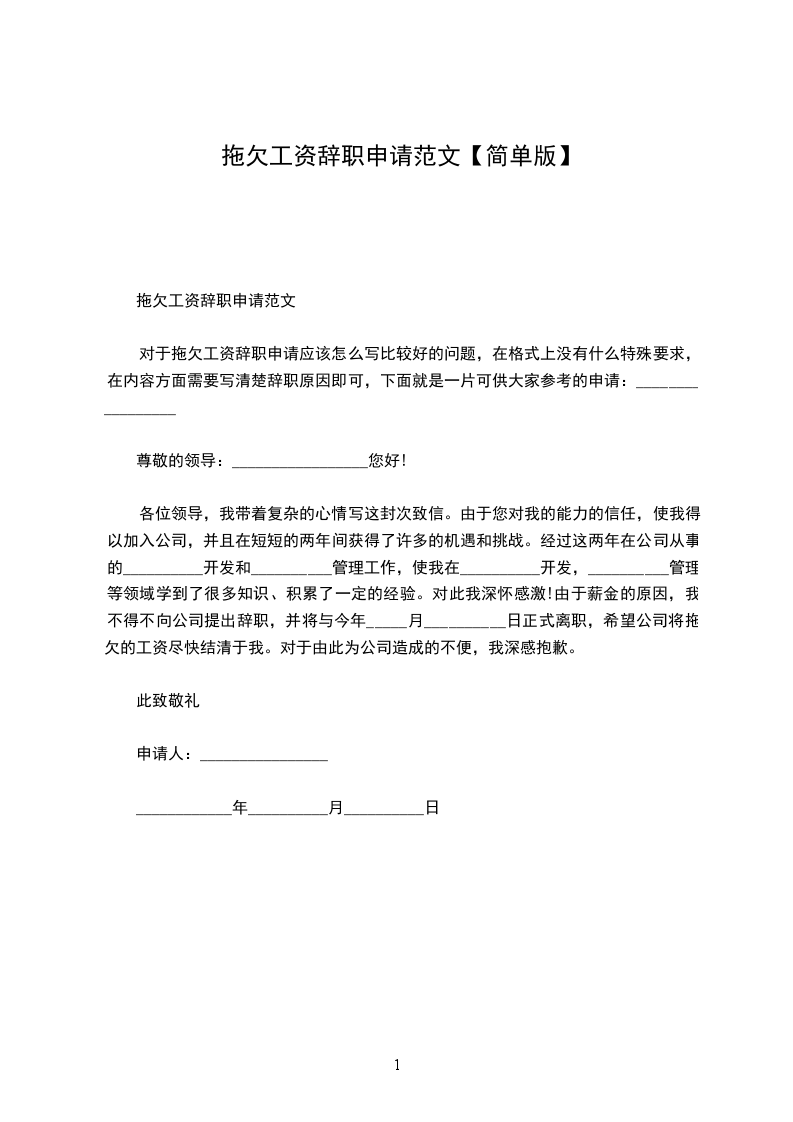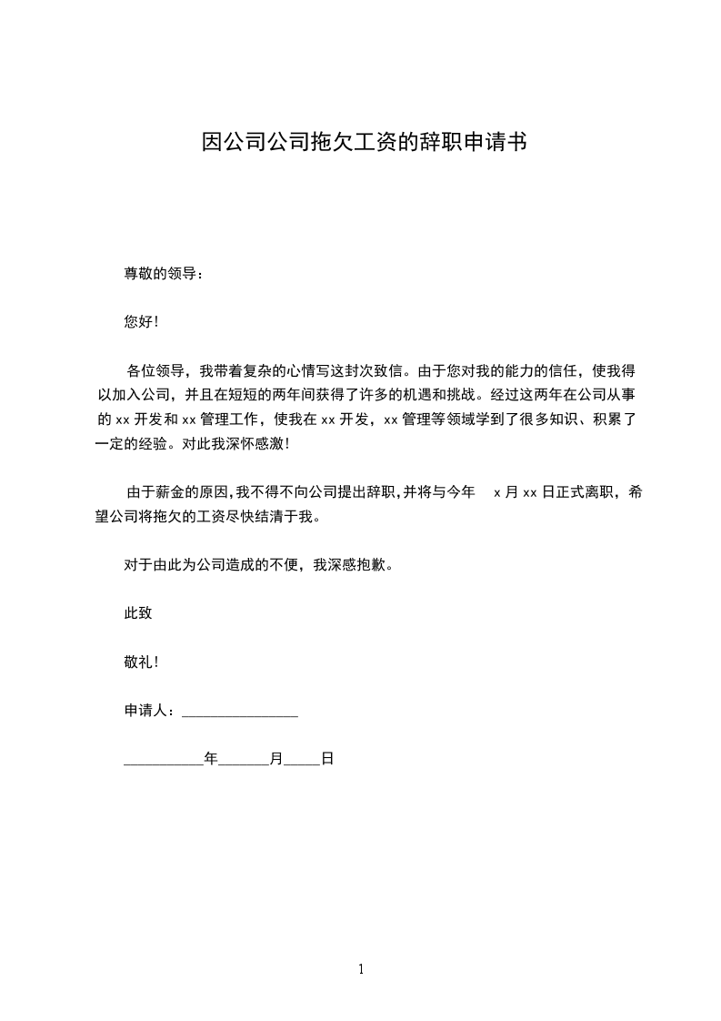 由于薪金的原因,我不得不向公司提出辞职,并将与今年x月xx日正式离职,希望公司将拖欠的工资尽快结清于我。