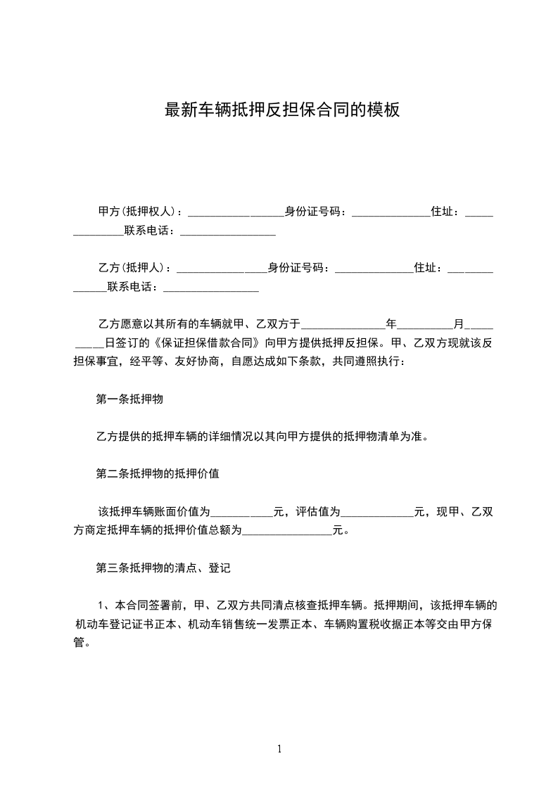 乙方愿意以其所有的车辆就甲、乙双方于_______________年__________月__________日签订的《保证担保借款合同》向甲方提供抵押反担保。甲、乙双方现就该反担保事宜,经平等、友好协商,自愿达成如下条款,共同遵照执行: