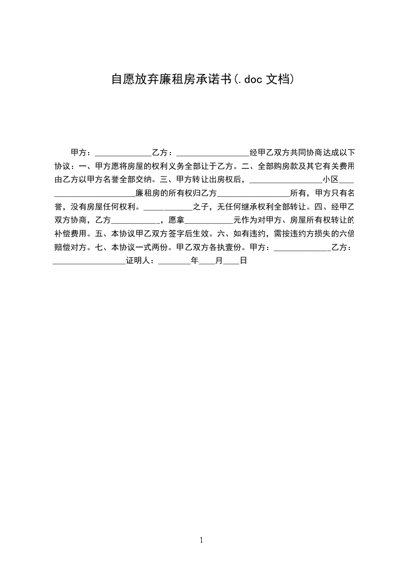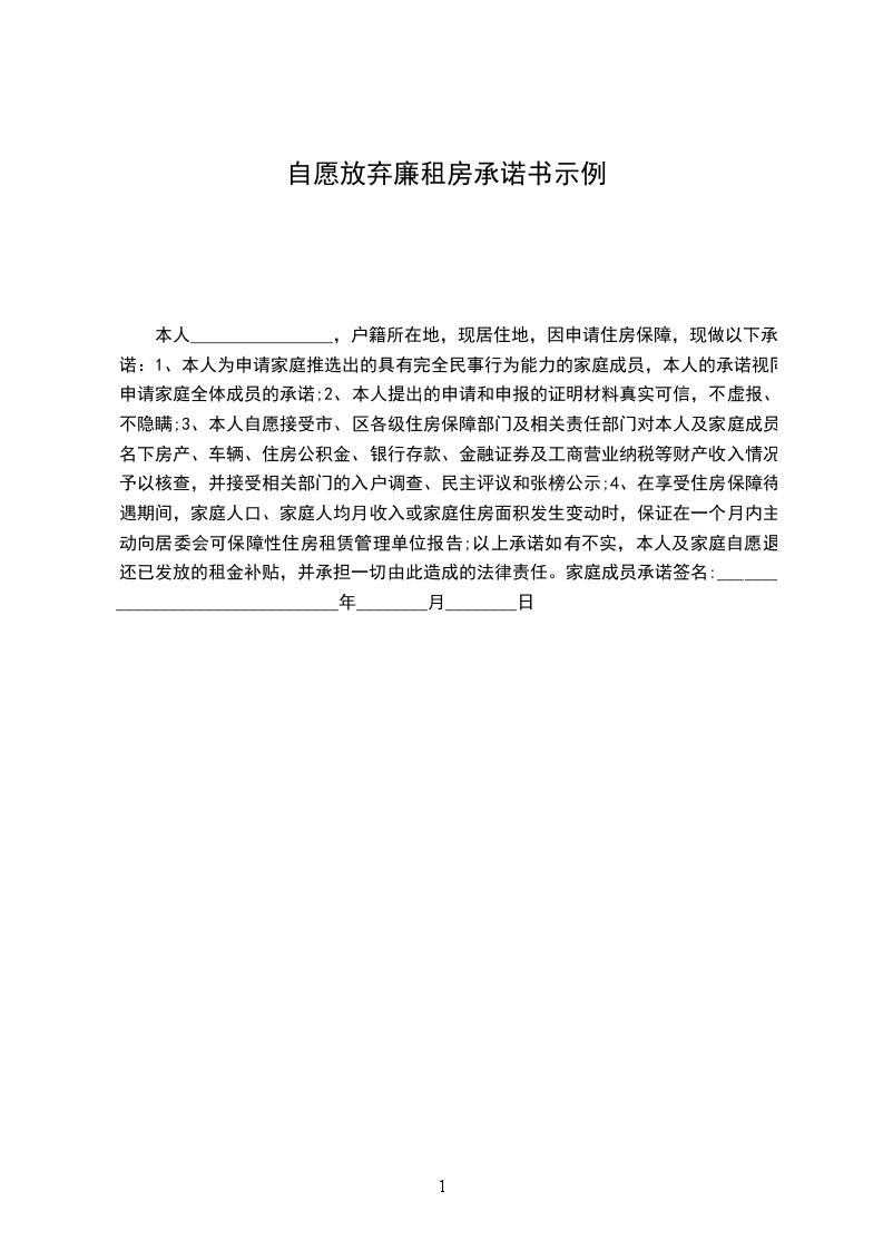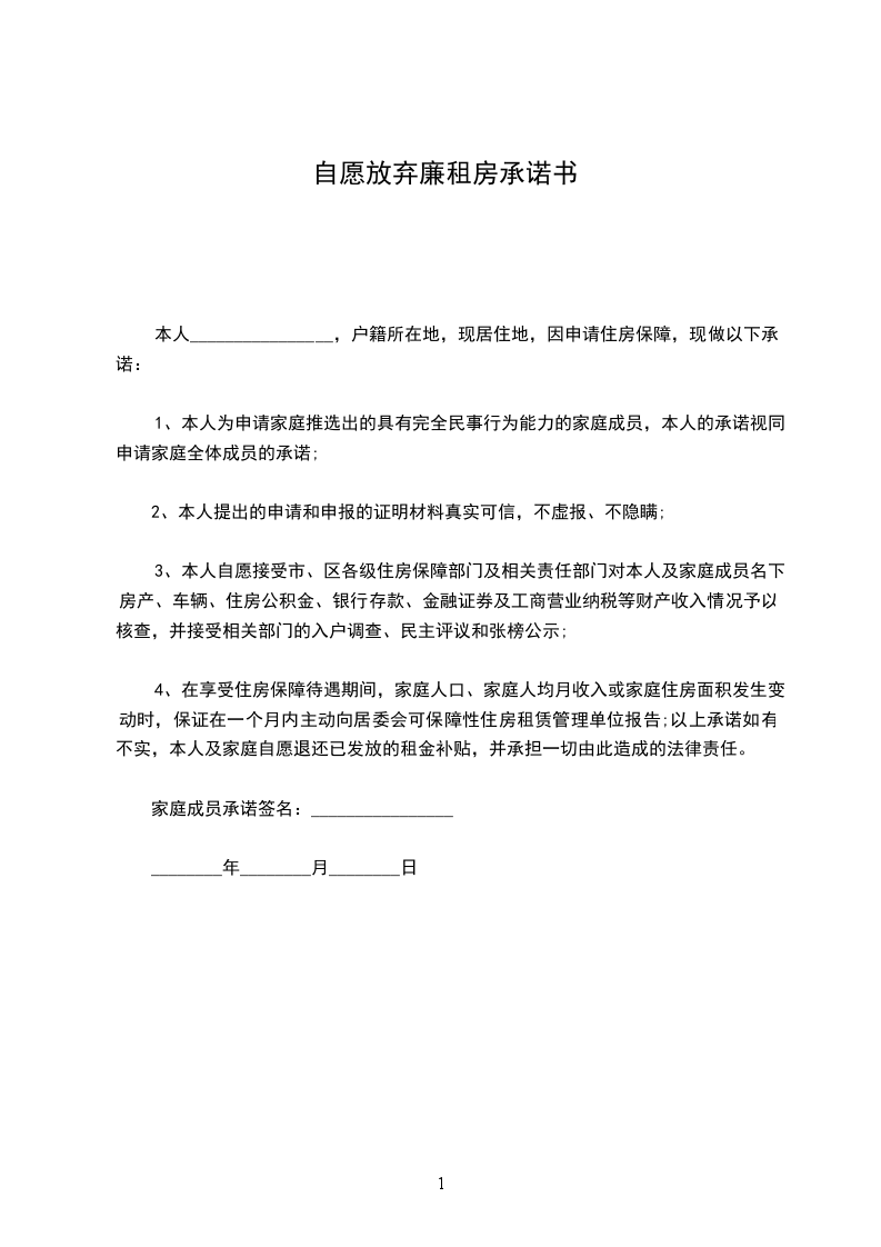 4、在享受住房保障待遇期间,家庭人口、家庭人均月收入或家庭住房面积发生变动时,保证在一个月内主动向居委会可保障性住房租赁管理单位报告;以上承诺如有不实,本人及家庭自愿退还已发放的租金补贴,并承担一切由此造成的法律责任。