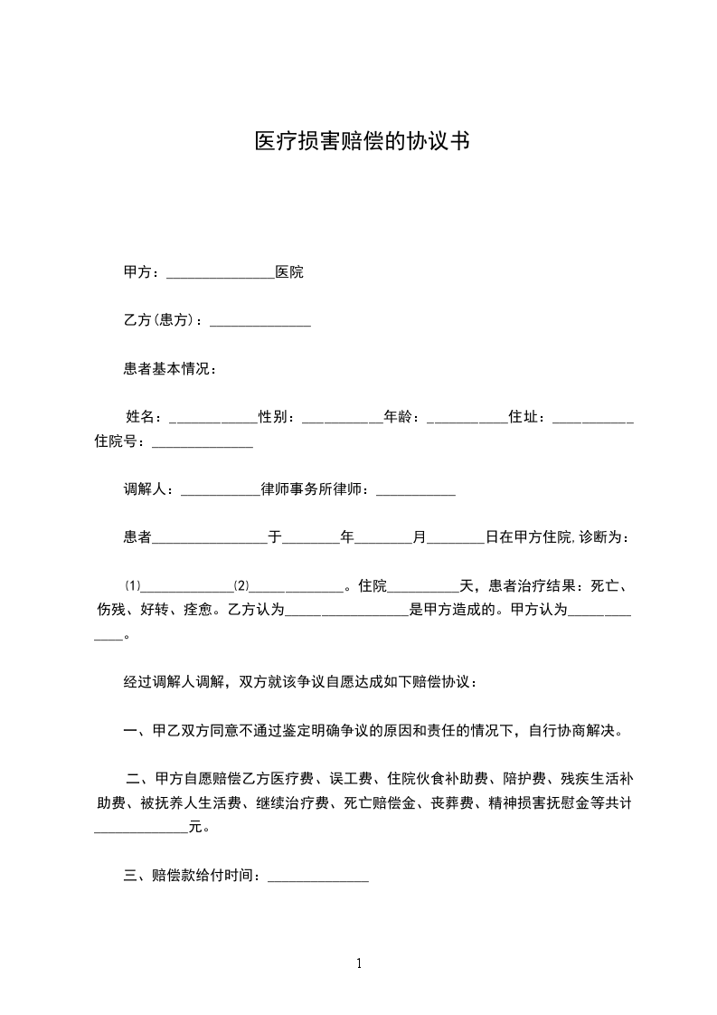 ⑴_____________⑵_____________。住院__________天,患者治疗结果:死亡、伤残、好转、痊愈。乙方认为_________________是甲方造成的。甲方认为_____________。