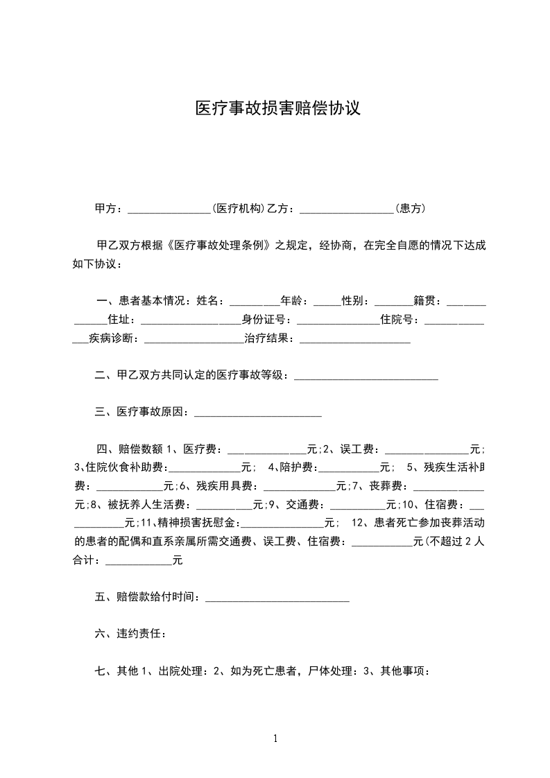 二、甲方自愿赔偿乙方医疗费、误工费、住院伙食补助费、陪护费、残疾生活补助费、被抚养人生活费、继续治疗费、死亡赔偿金、丧葬费、精神损害抚慰金等共计_____________元。