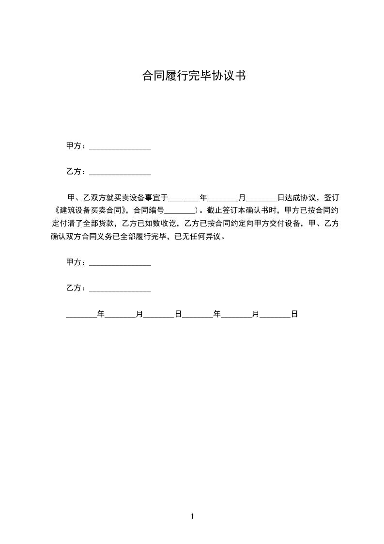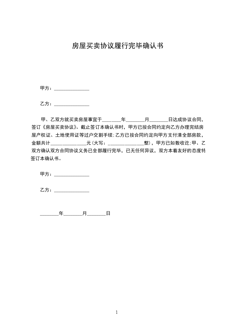 甲、乙双方就买卖房屋事宜于________年________月________日达成协议合同,签订《房屋买卖协议》。截止签订本确认书时,甲方已按合同约定向乙方办理完结房屋产权证、土地使用证等过户交割手续;乙方已按合同约定向甲方支付清全部房款,金额共计_______________元(大写:_______________整),甲方已如数收讫;甲、乙双方确认双方合同协议义务已全部履行完毕,已无任何异议,双方本着友好的态度特签订本确认书。