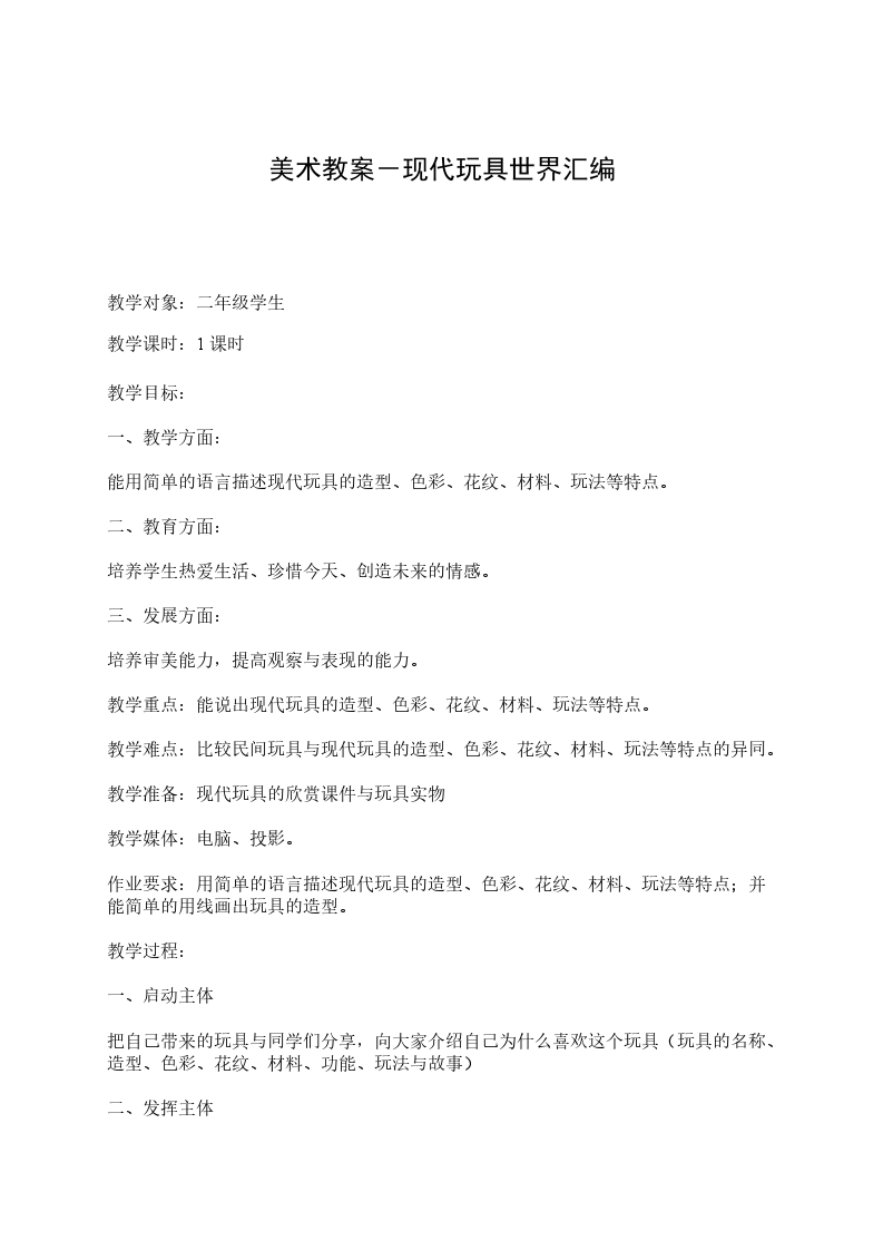 教学目标:能用简单的语言描述民间玩具的造型、色彩、花纹、材料;在比较中体验民间玩具不同的材料、用途和地方文化艺术特色、审美特色。