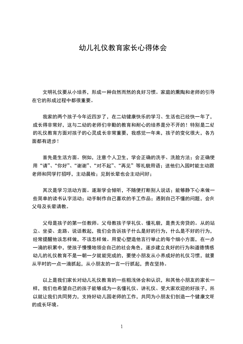 以上是我们家长对幼儿礼仪教育的一些粗浅体会和认识,和其他小朋友的家长一样,我们也希望自己的孩子能够成为一名懂礼仪、讲礼仪、受大家欢迎的好孩子,所以就让我们共同努力,支持好幼儿园老师的工作,共同为小朋友们创造一个健康文明的成长环境。