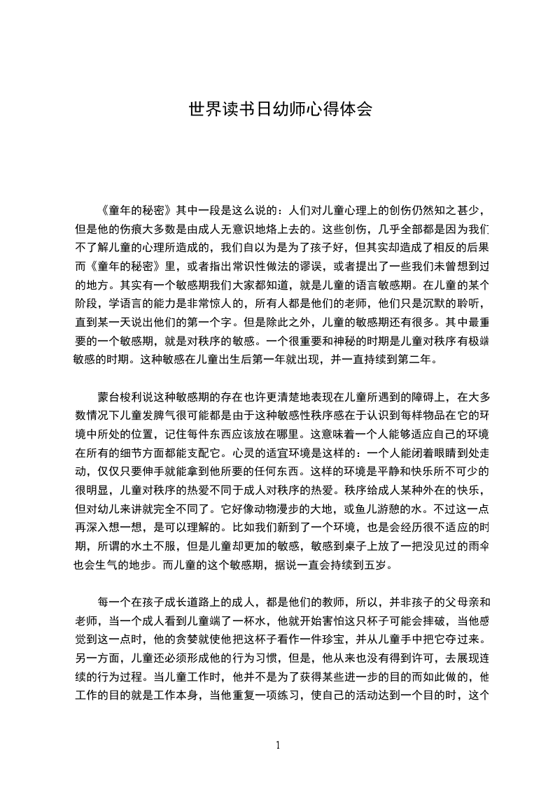 《童年的秘密》其中一段是这么说的:人们对儿童心理上的创伤仍然知之甚少,但是他的伤痕大多数是由成人无意识地烙上去的。这些创伤,几乎全部都是因为我们不了解儿童的心理所造成的,我们自以为是为了孩子好,但其实却造成了相反的后果。而《童年的秘密》里,或者指出常识性做法的谬误,或者提出了一些我们未曾想到过的地方。其实有一个敏感期我们大家都知道,就是儿童的语言敏感期。在儿童的某个阶段,学语言的能力是非常惊人的,所有人都是他们的老师,他们只是沉默的聆听,直到某一天说出他们的第一个字。但是除此之外,儿童的敏感期还有很多。其中最重要的一个敏感期,就是对秩序的敏感。一个很重要和神秘的时期是儿童对秩序有极端敏感的时期。这种敏感在儿童出生后第一年就出现,并一直持续到第二年。