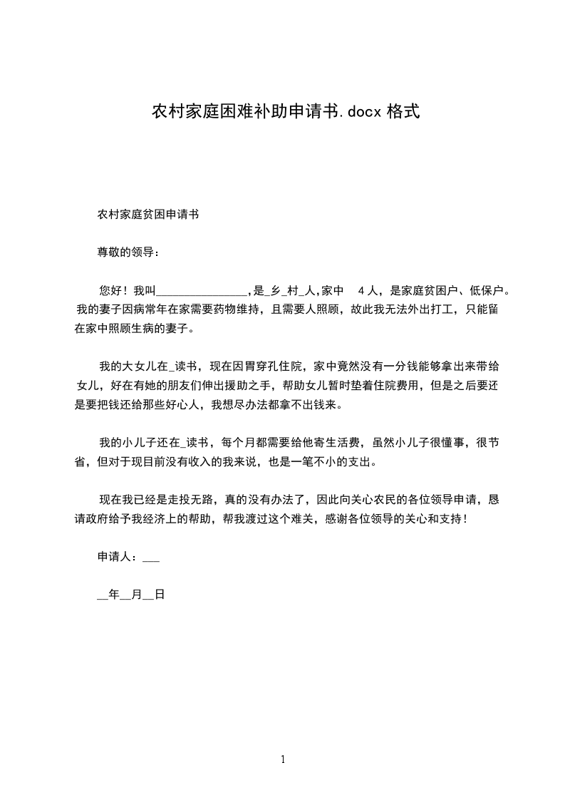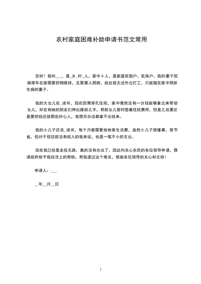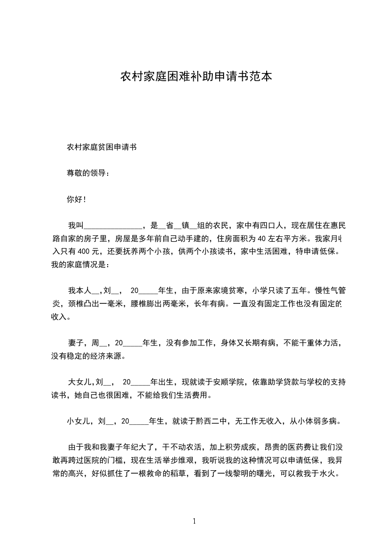 我叫_______________,是__省__镇__组的农民,家中有四口人,现在居住在惠民路自家的房子里,房屋是多年前自己动手建的,住房面积为40左右平方米。我家月收入只有400元,还要抚养两个小孩,供两个小孩读书,家中生活困难,特申请低保。我的家庭情况是: