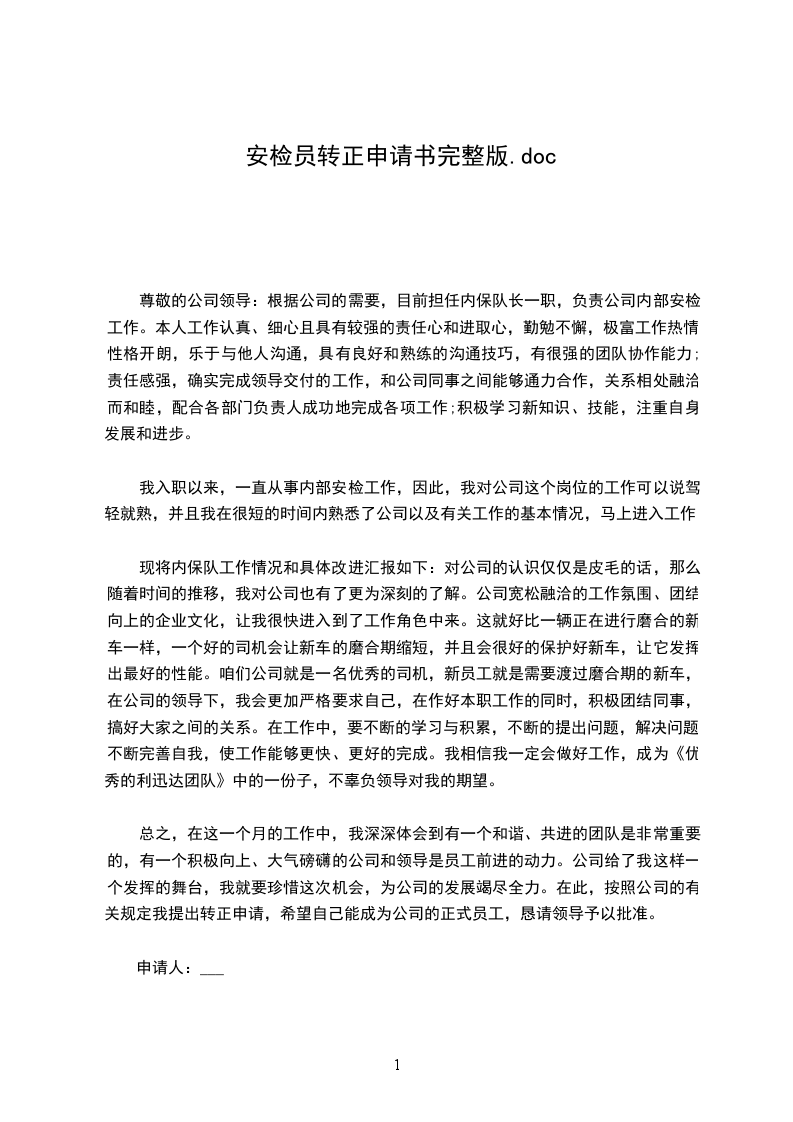 尊敬的公司领导:根据公司的需要,目前担任内保队长一职,负责公司内部安检工作。本人工作认真、细心且具有较强的责任心和进取心,勤勉不懈,极富工作热情;性格开朗,乐于与他人沟通,具有良好和熟练的沟通技巧,有很强的团队协作能力;责任感强,确实完成领导交付的工作,和公司同事之间能够通力合作,关系相处融洽而和睦,配合各部门负责人成功地完成各项工作;积极学习新知识、技能,注重自身发展和进步。