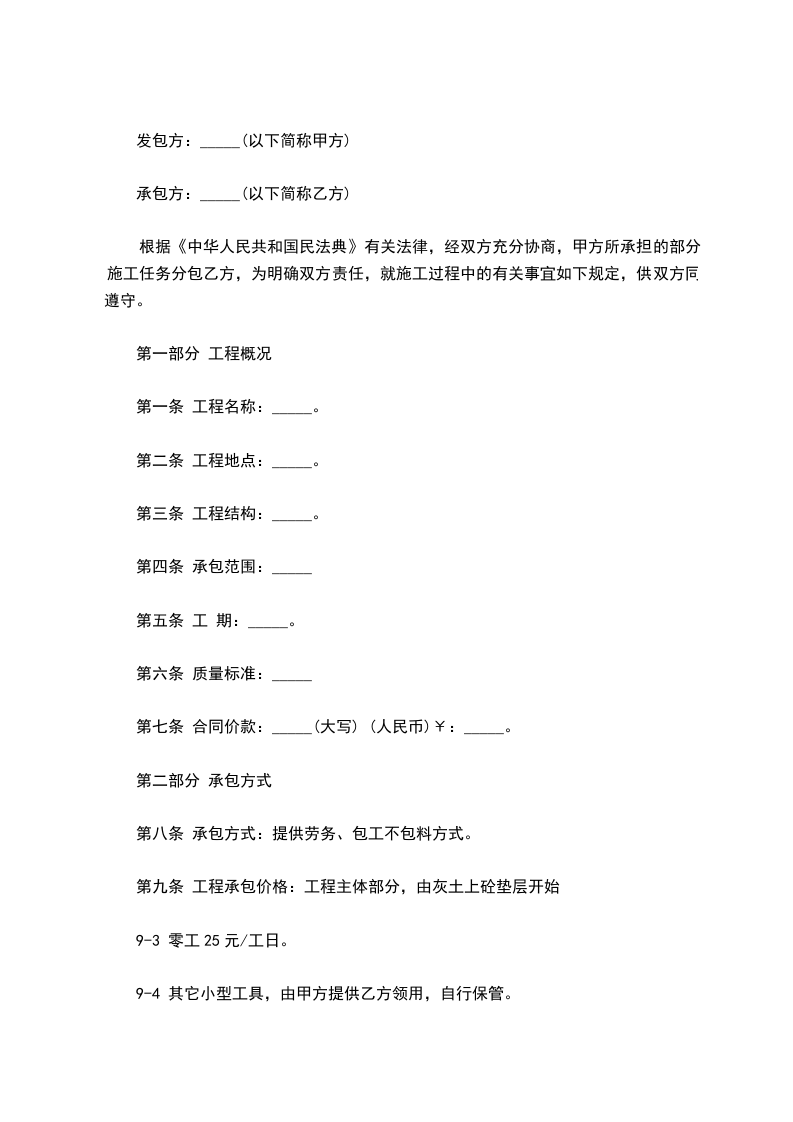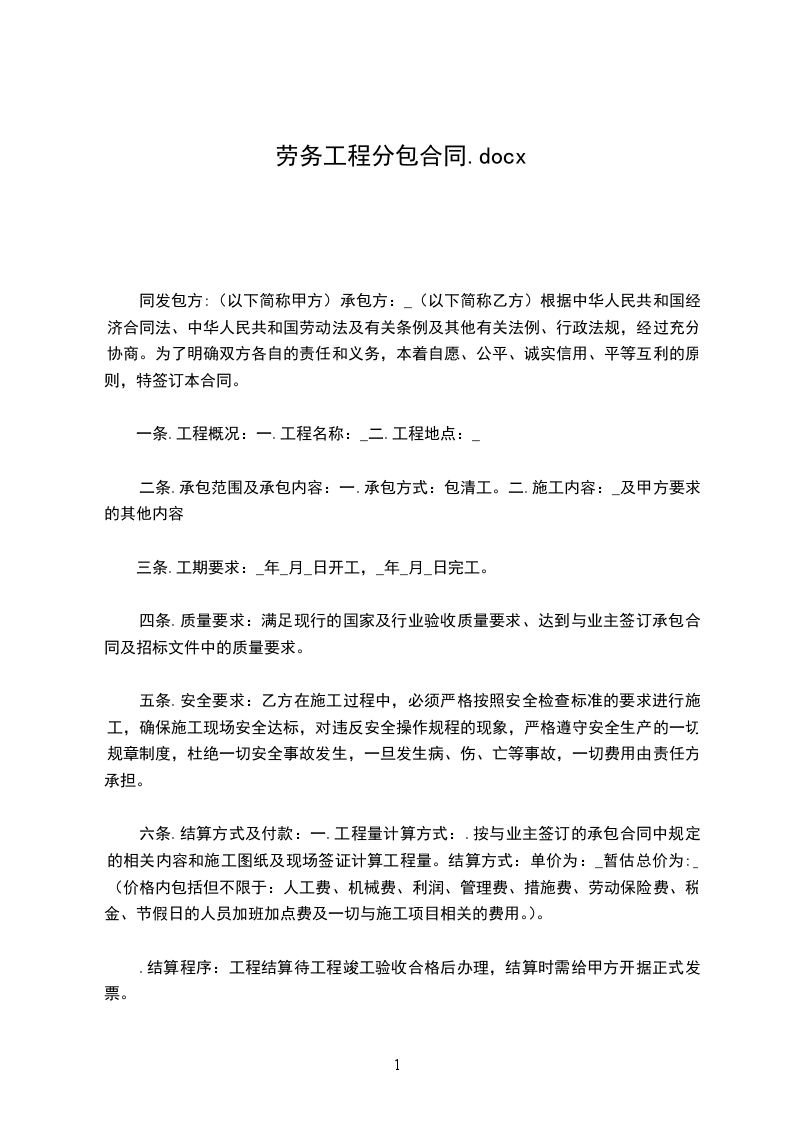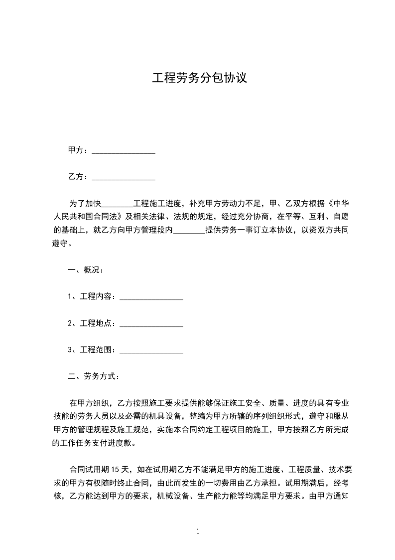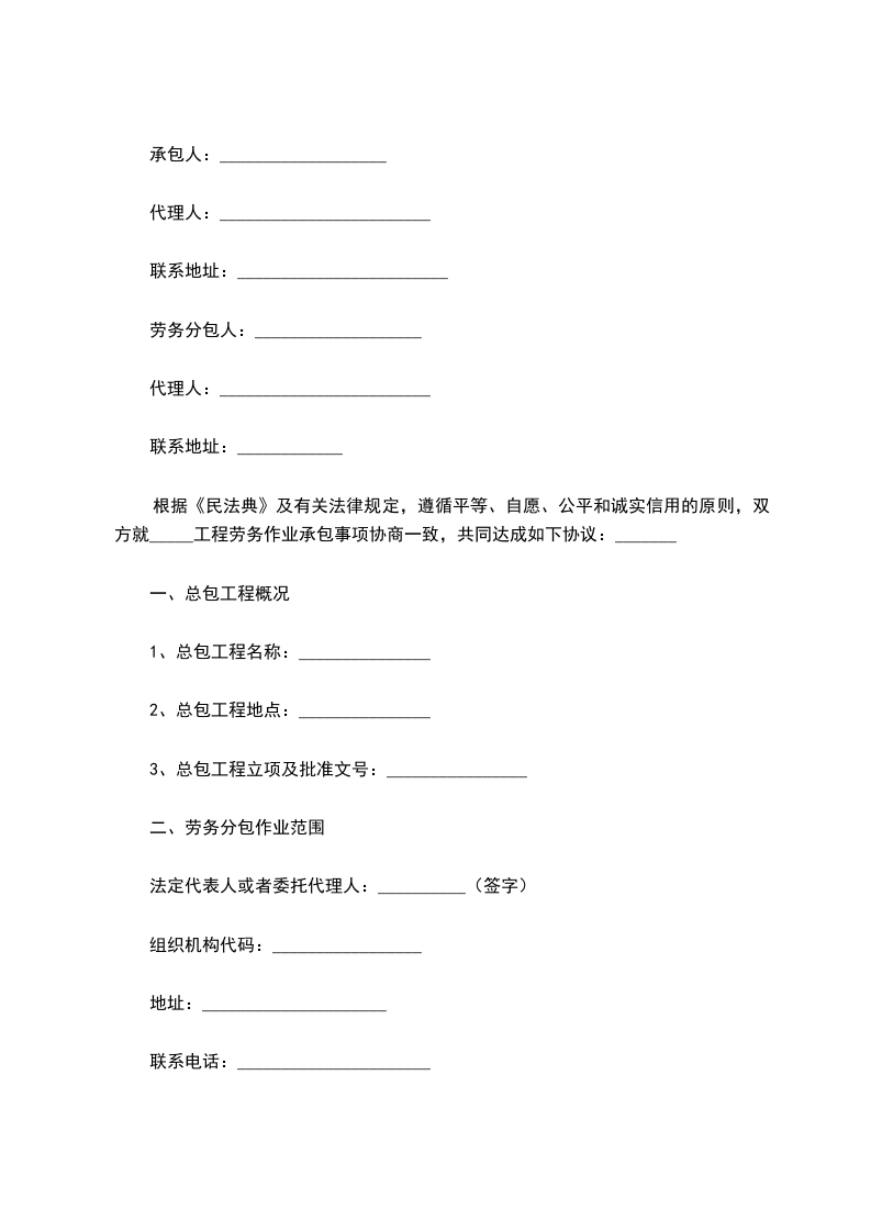 为了加快________工程施工进度,补充甲方劳动力不足,甲、乙双方根据《中华人民共和国民法典》及相关法律、法规的规定,经过充分协商,在平等、互利、自愿的基础上,就乙方向甲方管理段内________提供劳务一事订立本协议,以资双方共同遵守。