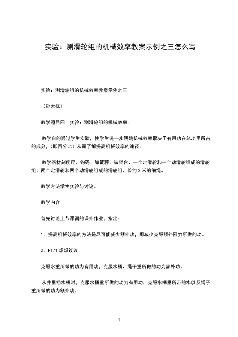 引言:本节课我们要通过测滑轮的机械效率,要进一步明确决定机械效率的两个条件,通过几个不同的方法所测定的效率,进一步认识提高机械效率的实际意义。