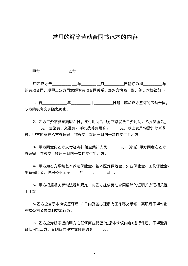 1、自_____________年__________月__________日起,解除双方签订的劳动合同,双方的权利义务随之终止;