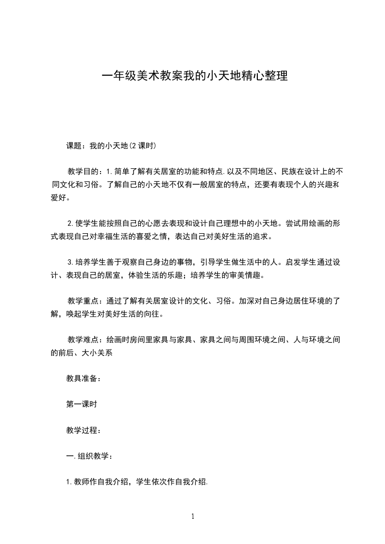 教学目的:1.简单了解有关居室的功能和特点.以及不同地区、民族在设计上的不同文化和习俗。了解自己的小天地不仅有一般居室的特点,还要有表现个人的兴趣和爱好。