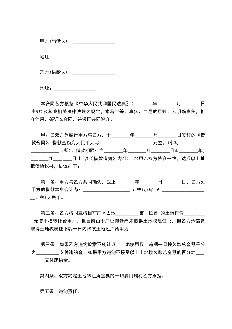 甲、乙双方为履行甲方与乙方:于________年________月________日签订的《借款合同》,借款金额为人民币大写: ____________________元整,(小写: ____________________元整)。借款期限:自________年________月________日至________年________月________日止(以《借款借据》为准),经甲乙双方协商一致,达成以土地抵债协议书,协议如下:
