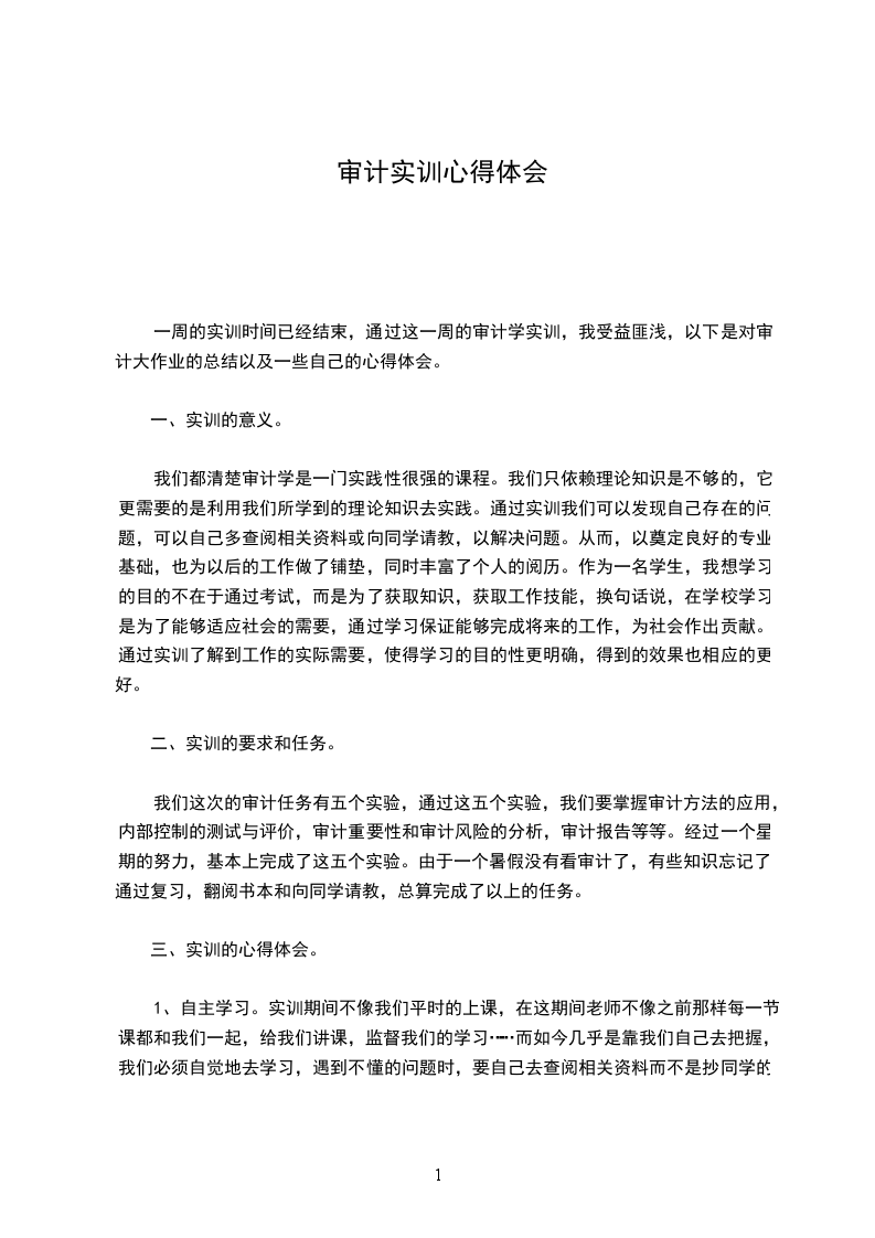 总之,通过这次审计实训使我发现了自己的不足之处,也收获了不少,我将会更努力地学习相关的学科知识,切记:理论与实践相结合!