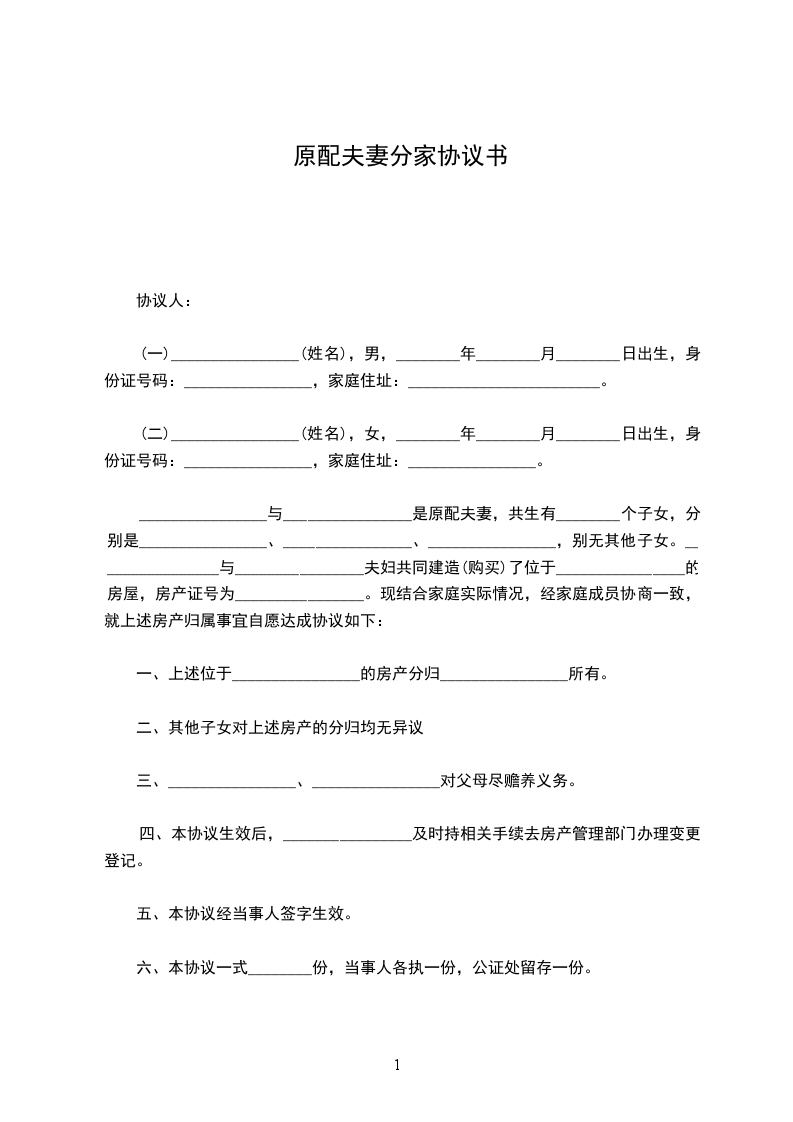 ________________与________________是原配夫妻,共生有________个子女,分别是________________、________________、________________,别无其他子女。________________与________________夫妇共同建造(购买)了位于________________的房屋,房产证号为________________。现结合家庭实际情况,经家庭成员协商一致,就上述房产归属事宜自愿达成协议如下: