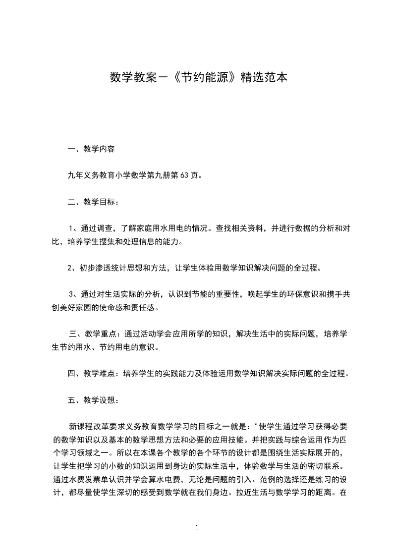 新课程改革要求义务教育数学学习的目标之一就是:"使学生通过学习获得必要的数学知识以及基本的数学思想方法和必要的应用技能。并把实践与综合运用作为四个学习领域之一。所以在本课各个教学的各个环节的设计都是围绕生活实际展开的,让学生把学习的小数的知识运用到身边的实际生活中,体验数学与生活的密切联系。通过水费发票单认识并学会算水电费,无论是问题的引入、范例的选择还是练习的设计,都尽量使学生深切的感受到数学就在我们身边。拉近生活与数学学习的距离。在教学中联系节约用电、用水的知识和环境保护的知识,更近一步的贴近了我们的生活,并用一首优美的乐曲结束全课,激励学生的情感态度,唤起全民的节能意识和建设美好家园的使命和责任感,又使教学从单一的学科教学走向多学科、多功能的综合。