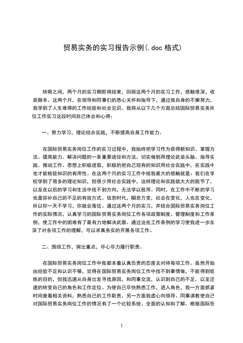 转眼之间,两个月的实习期即将结束,回顾这两个月的实习工作,感触很深,收获颇丰。这两个月,在领导和同事们的悉心关怀和指导下,通过我自身的不懈努力,我学到了人生难得的工作经验和社会见识。我将从以下几个方面总结国际贸易实务岗位工作实习这段时间自己体会和心得: