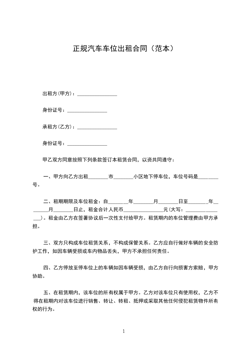 一、甲方向乙方出租________市________小区地下停车位,车位号码是________号。
