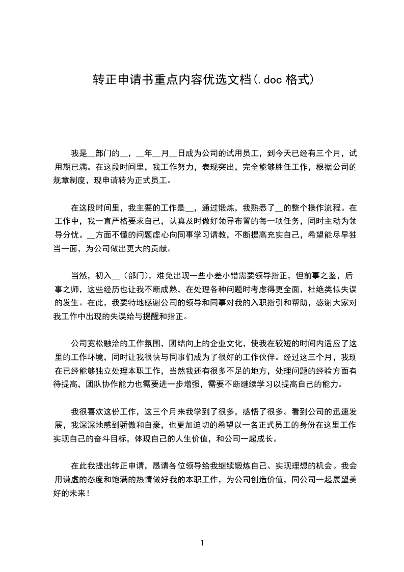 我是__部门的__,__年__月__日成为公司的试用员工,到今天已经有三个月,试用期已满。在这段时间里,我工作努力,表现突出,完全能够胜任工作,根据公司的规章制度,现申请转为正式员工。