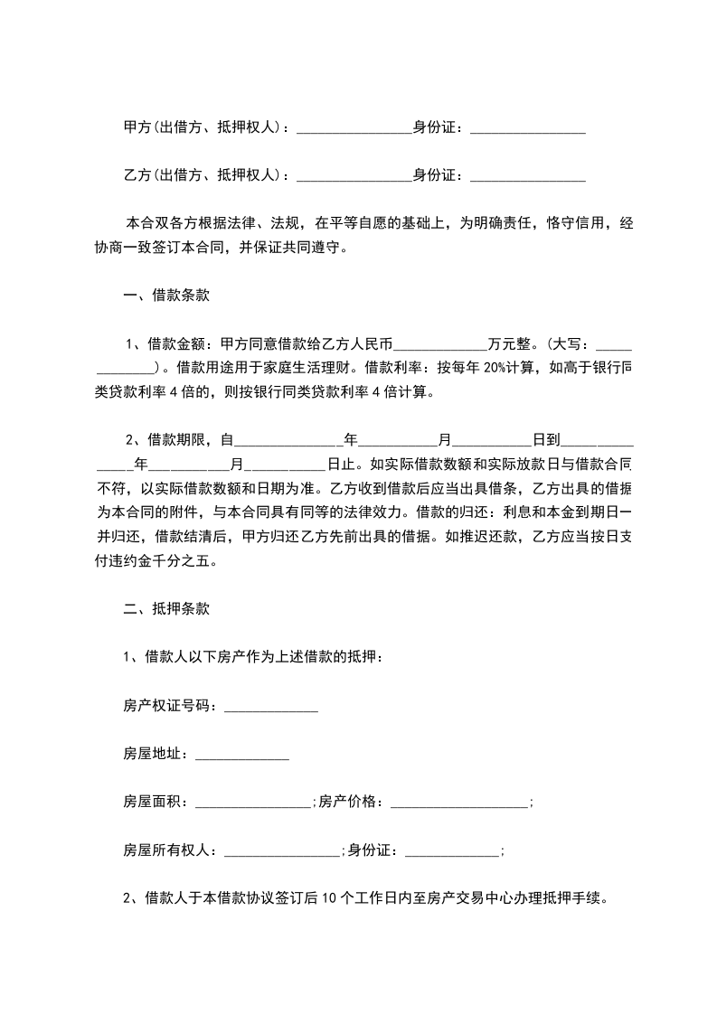 1、借款金额:甲方同意借款给乙方人民币_____________万元整。(大写:_____________)。借款用途用于家庭生活理财。借款利率:按每年20%计算,如高于银行同类贷款利率4倍的,则按银行同类贷款利率4倍计算。