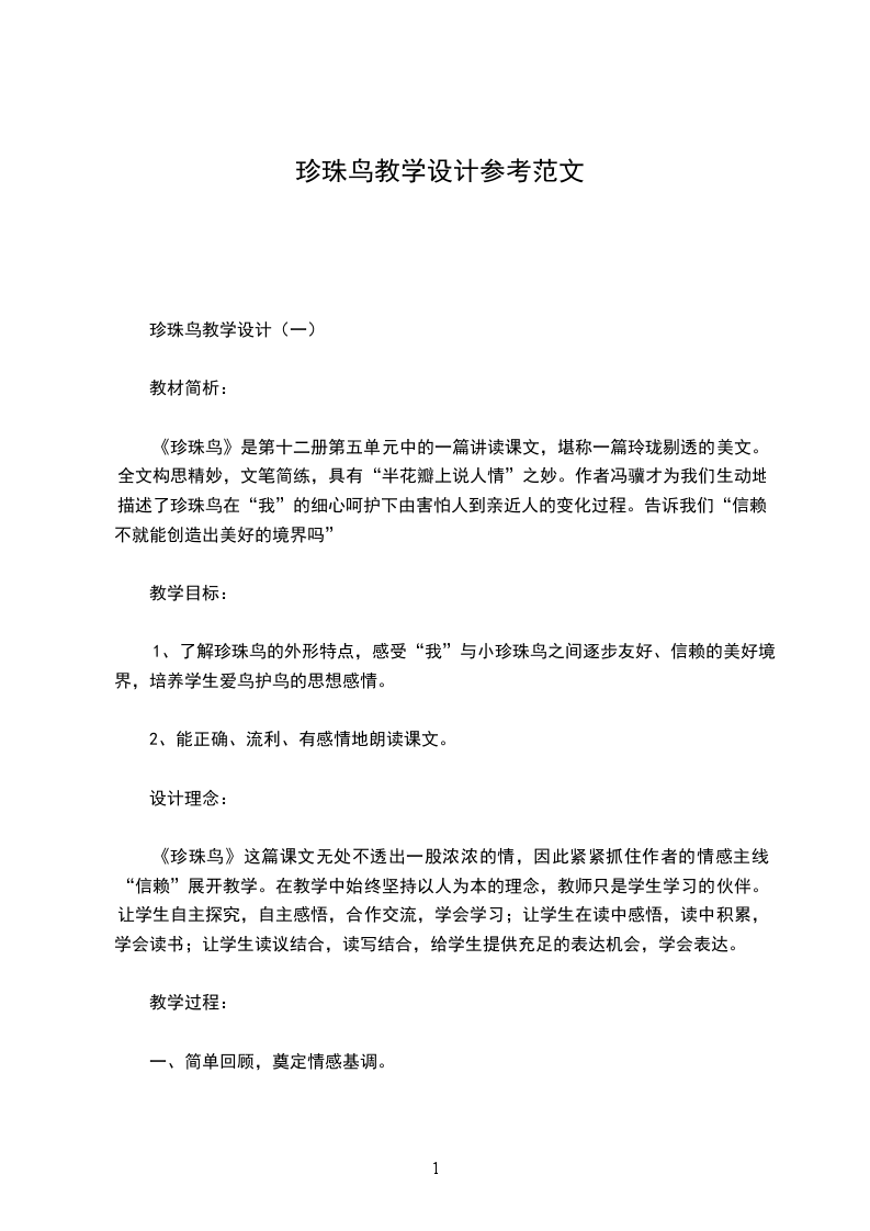 珍珠鸟教学设计(一)