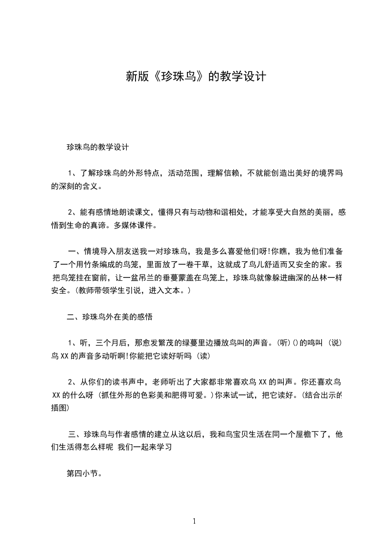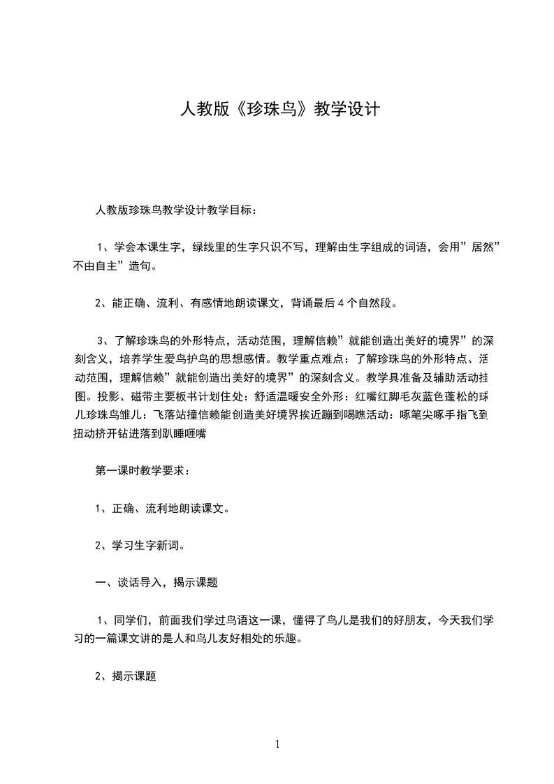 1、知识与能力:了解珍珠鸟的样子和特点,理解课文内容。