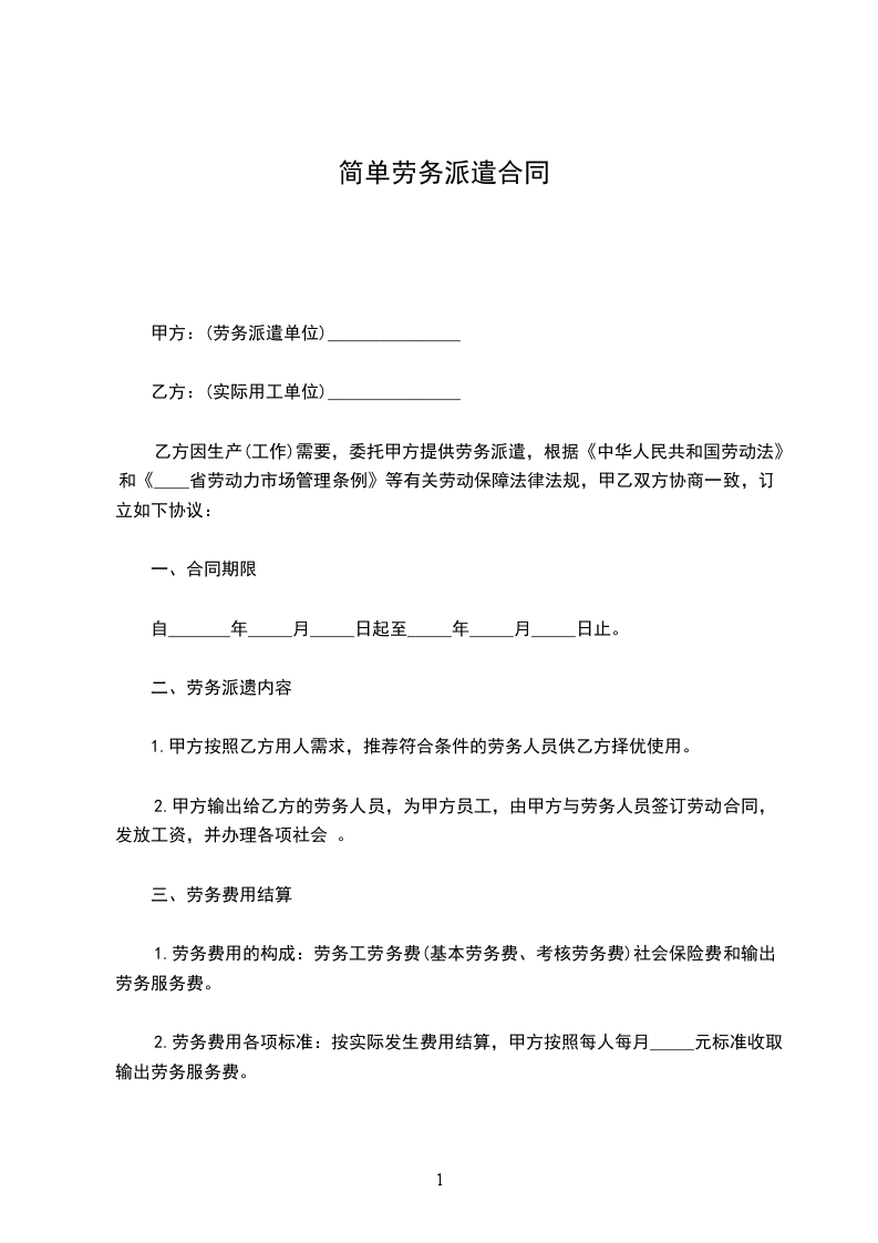 乙方:______________劳务派遣公司 地址:____________________________电话:______________
