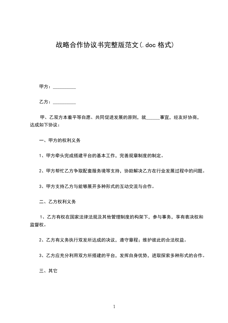 甲、乙双方本着平等自愿、共同促进发展的原则,就______事宜,经友好协商,达成如下协议: