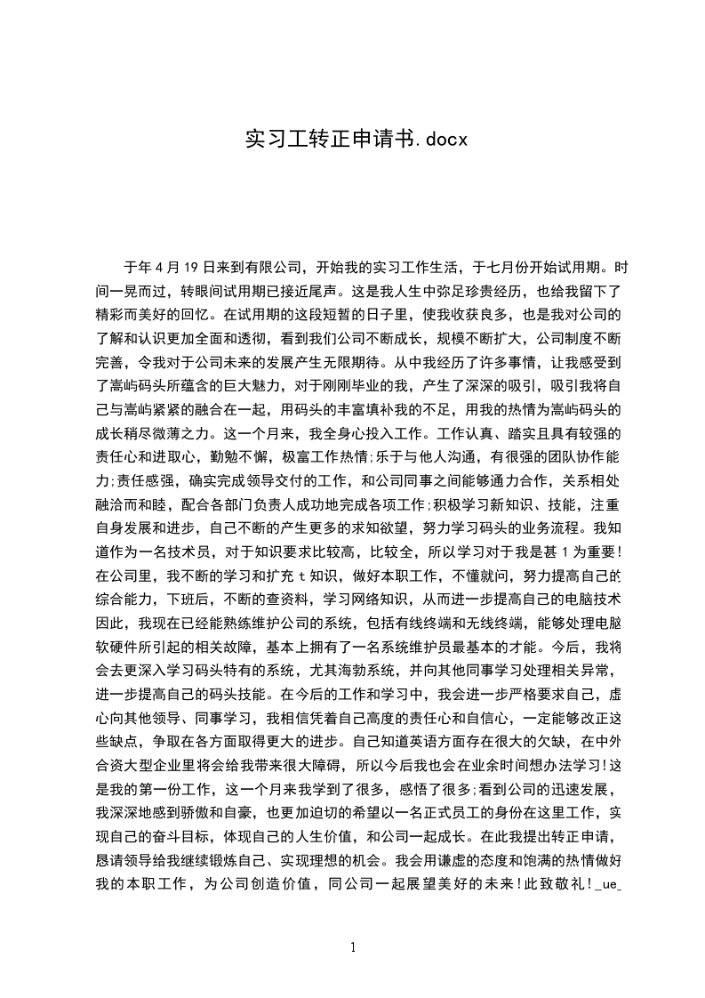 我于__年5月9日成为公司的试用员工,到今天6个月试用期已满,根据公司的规章制度,现申请转为公司正式员工。